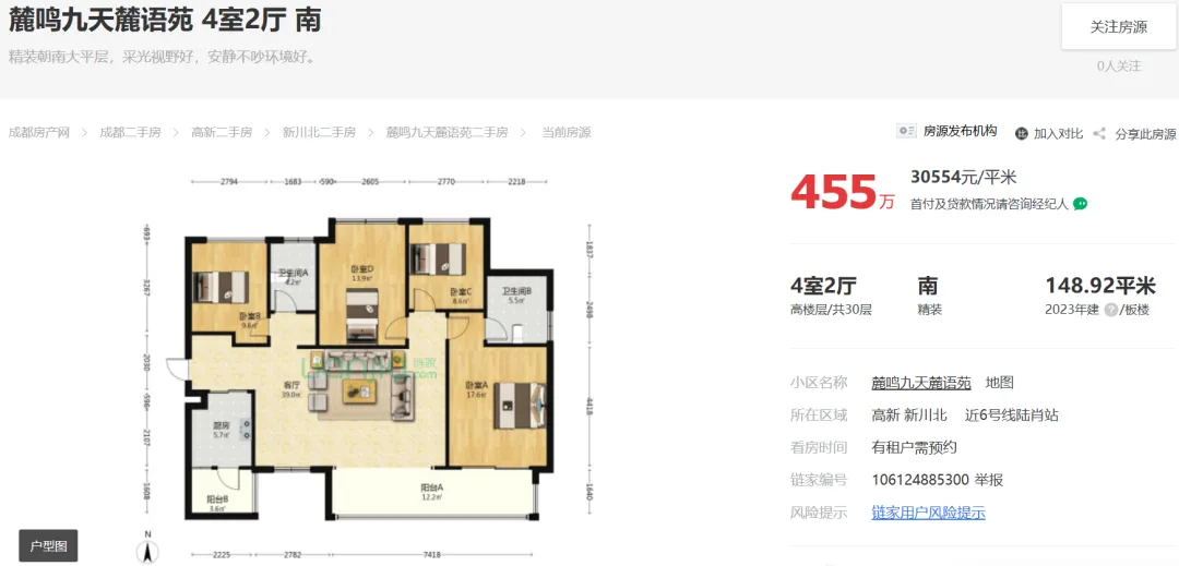 2026年02月15日,【那坊归心】成都成华槐树店存量房(二手房)邦泰云璟建面133平套四报价409万,是否适合90后?