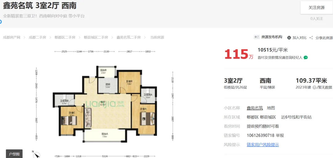 2026年02月24日,【那坊归心】成都郫都红光存量房(二手房)光谷云著建面102平套三报价103.8万,是否适合90后?