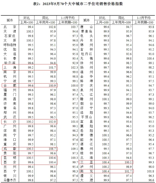 回到5月70城房价指数上,可以看到,真正实现二手房有所“收益”,也就是同比增长的,一共也就9个城市,分别是北京、上海、合肥、长沙、成都、昆明、西安、三亚和南充,其中北京、上海、合肥还有西安还都是环比下跌的。