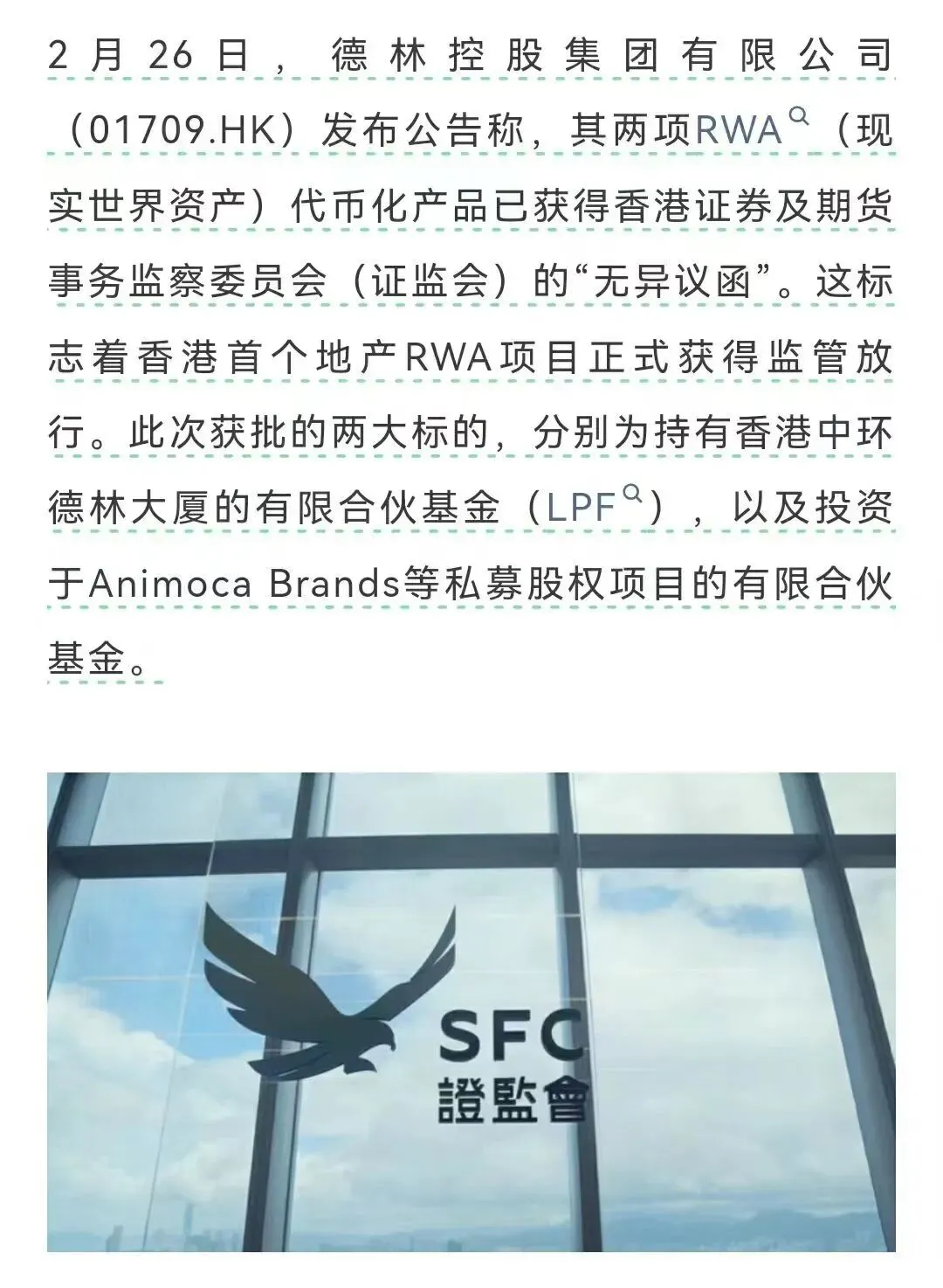 德林控股(01709.HK)正式拿到“无异议函”,要把中环的写字楼变成RWA(现实世界资产代币化)。简单说:这就是把昂贵的摩天大楼,“切碎”成一个个数字代币,让咱们普通人也能分一杯羹。
