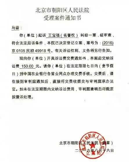 8月16日 ➔ 马蓉起诉王宝强侵犯名誉,要求删博并置顶道歉不低于30天