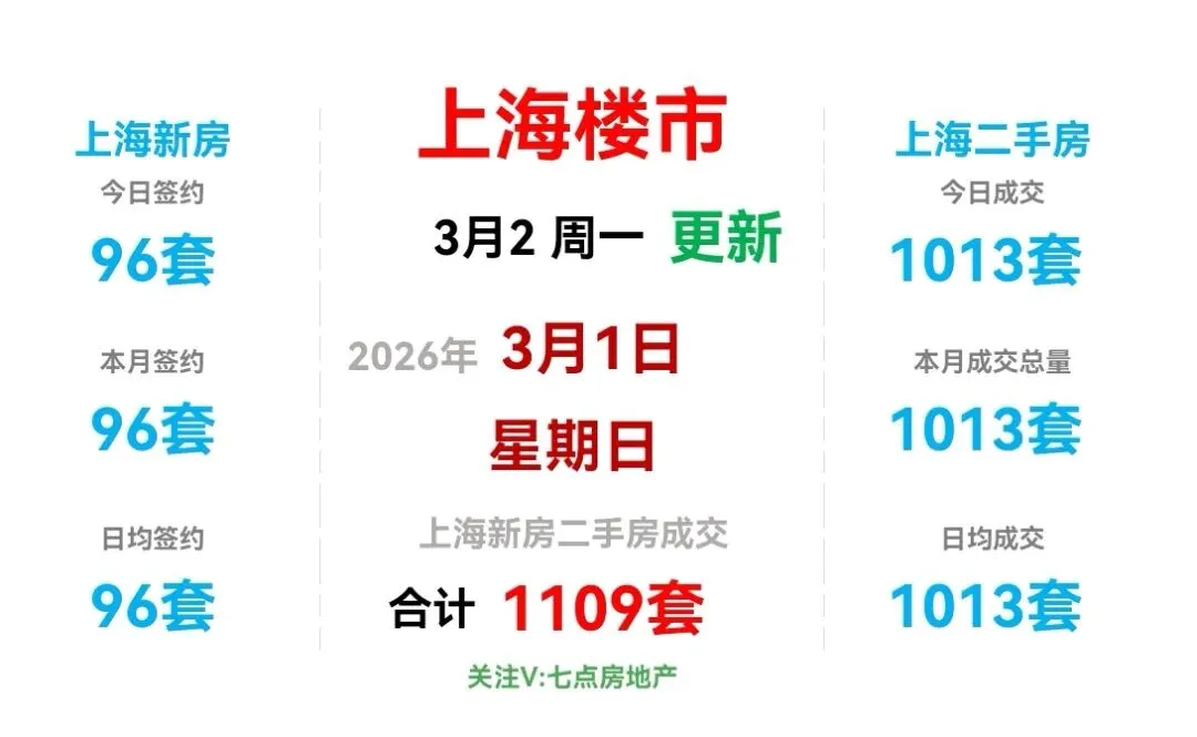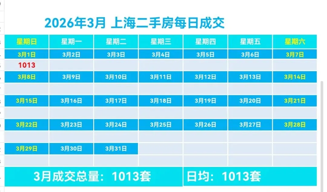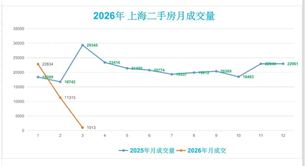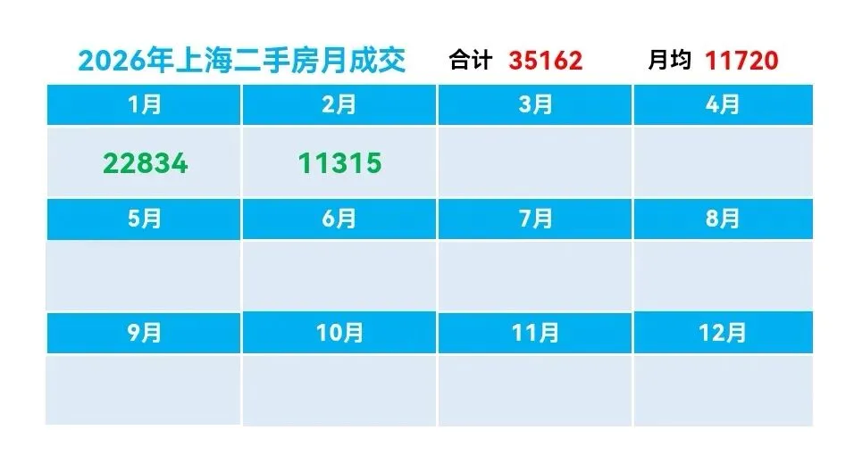 ♻️截止2026年3月1日,2026年上海二手房成交量合计35162套,月均21174套。