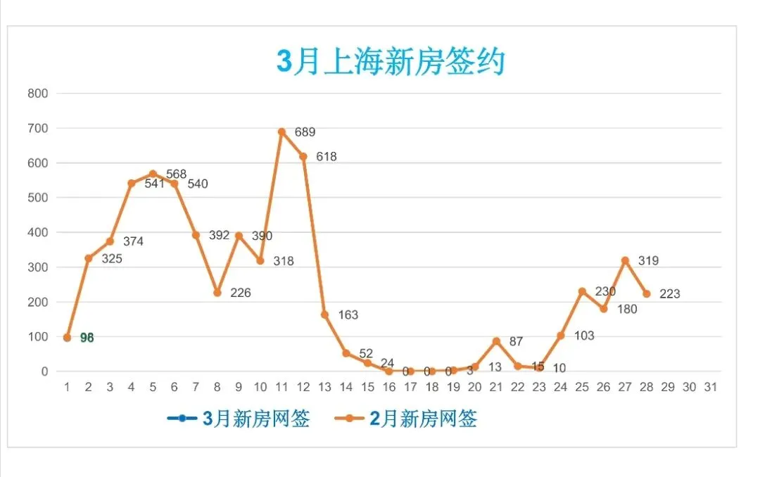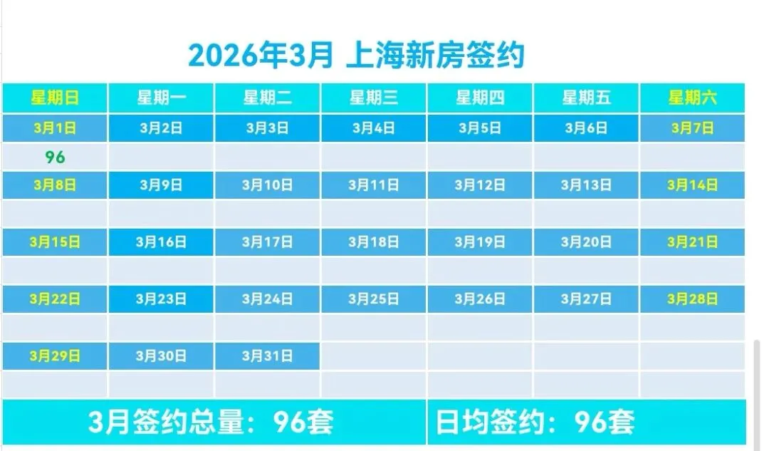 🏠昨日(3月1日,周日),上海新房签约96套,较前一日减少127套(降幅56.95%),日签约面积0.8万m²,套均面积83.33m²。🏠3月上海新房总签约96套,日均签约96套,本月签约总面积0.8万m²,套均面积83.33m²。