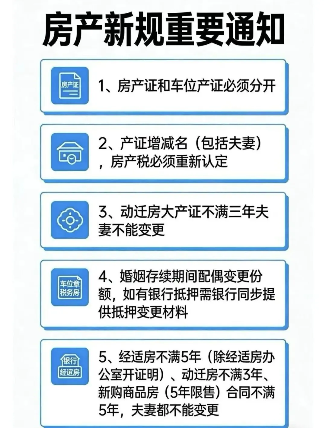• 新规:动迁安置房的开发商“大产证”办出未满3年的,夫妻之间不能办理产证变更(加名、去名、更名)。