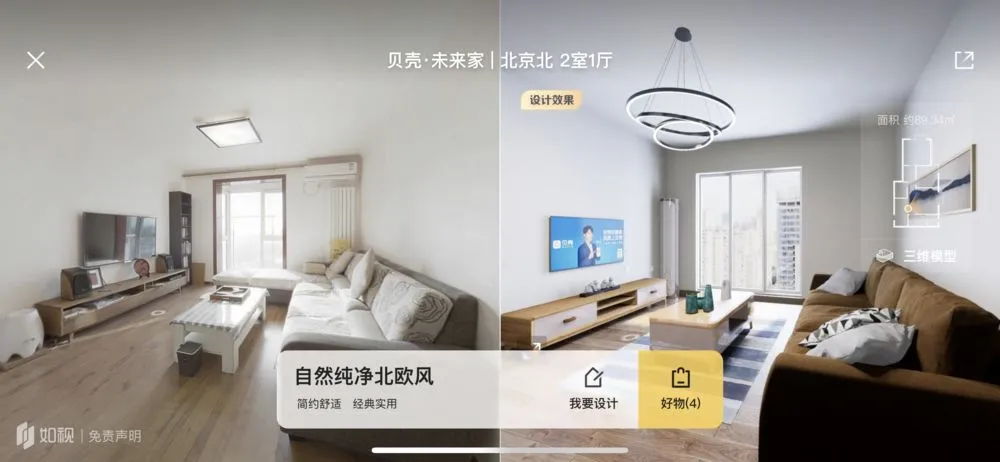 在看房的过程中用户可能会畅想房子装修后的效果,如果能立马复原用户的构思出具装修效果图,则能大大提升房产经纪人的签单成功率。为此,贝壳在VR三位重建技术之上叠加AI算法,可以将房屋三维户型图与智能设计相结合,通过家具、风格的实时渲染和拼接,在短时间内将购房者脑中的装修方案具象化,用户可以数秒内看见房子的装修情况。