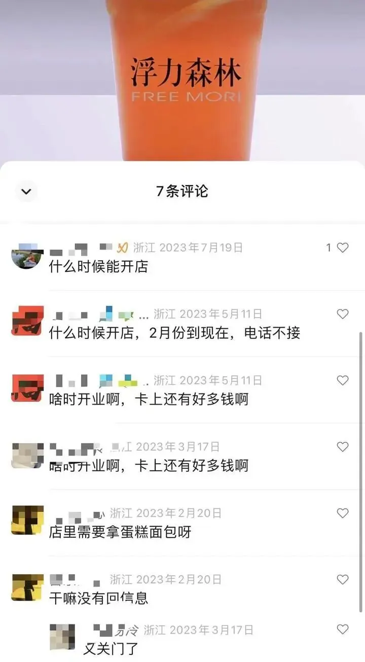 “浮力森林”门店的一个社交平台留言处,全是顾客询问门店何时重新开业的信息,留言无人回复。