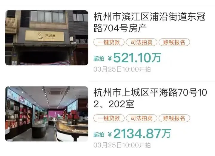 两处房产信息为:上城区平海路70号102、202室(性质:综合/非住宅,评估价30498200元,起拍价21348740)、滨江区浦沿街道东冠路704号房产(性质:一层为非住宅的商服用地,二至三层为住宅,评估价7443800元,起拍价5211000元)