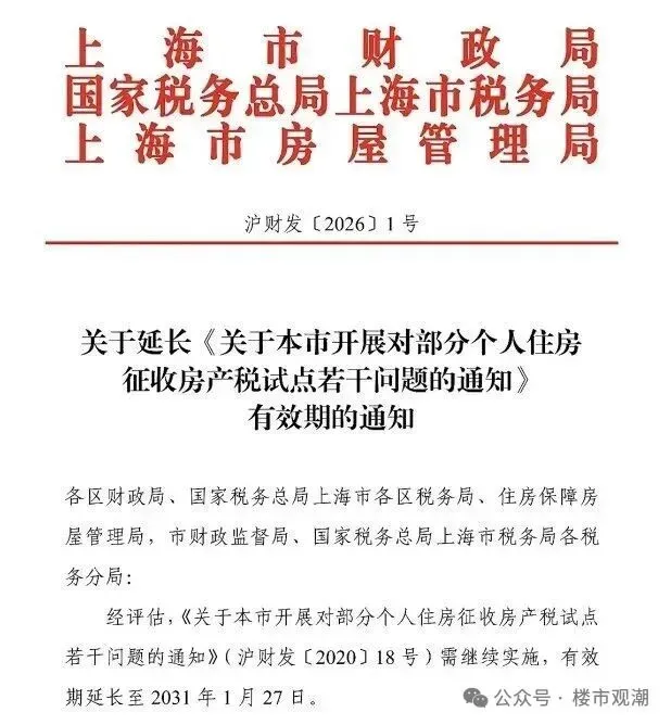 经评估,《关于本市开展对部分个人住房征收房产税试点若干问题的通知》(沪财发〔2020〕18号)需继续实施,有效期延长至2031年1月27日。