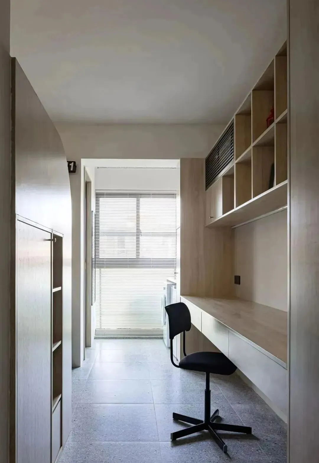 从入户往里走,与玄关柜紧连着的是一组长书桌,上面做了各自吊柜,下面是2.6米的悬空式抽屉书桌。