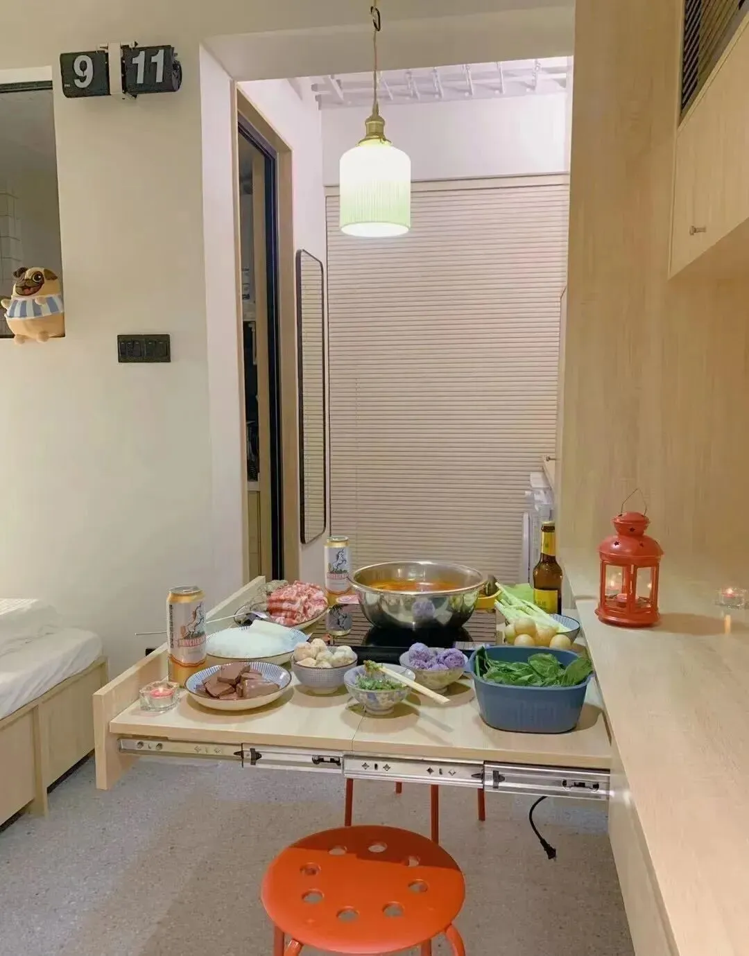 书桌中的其中一个抽屉设计成了可抽拉的层板,需要的时候把层板拉出来就能秒变餐桌家三口吃火锅都毫无压力。