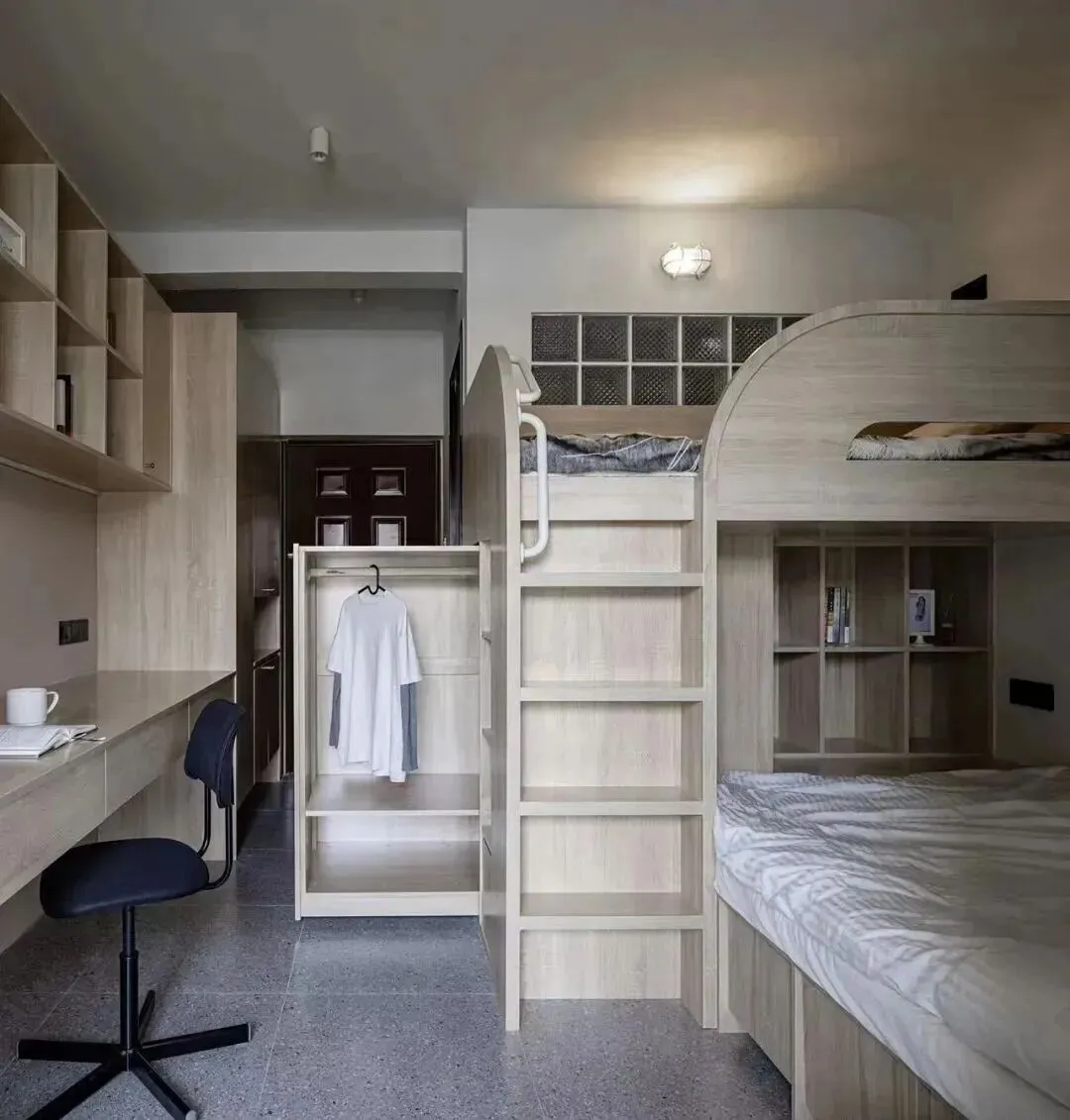 卧室空间非常有限,为了能放下儿童床和大人床,设计师采用了两床错层叠放的方式。