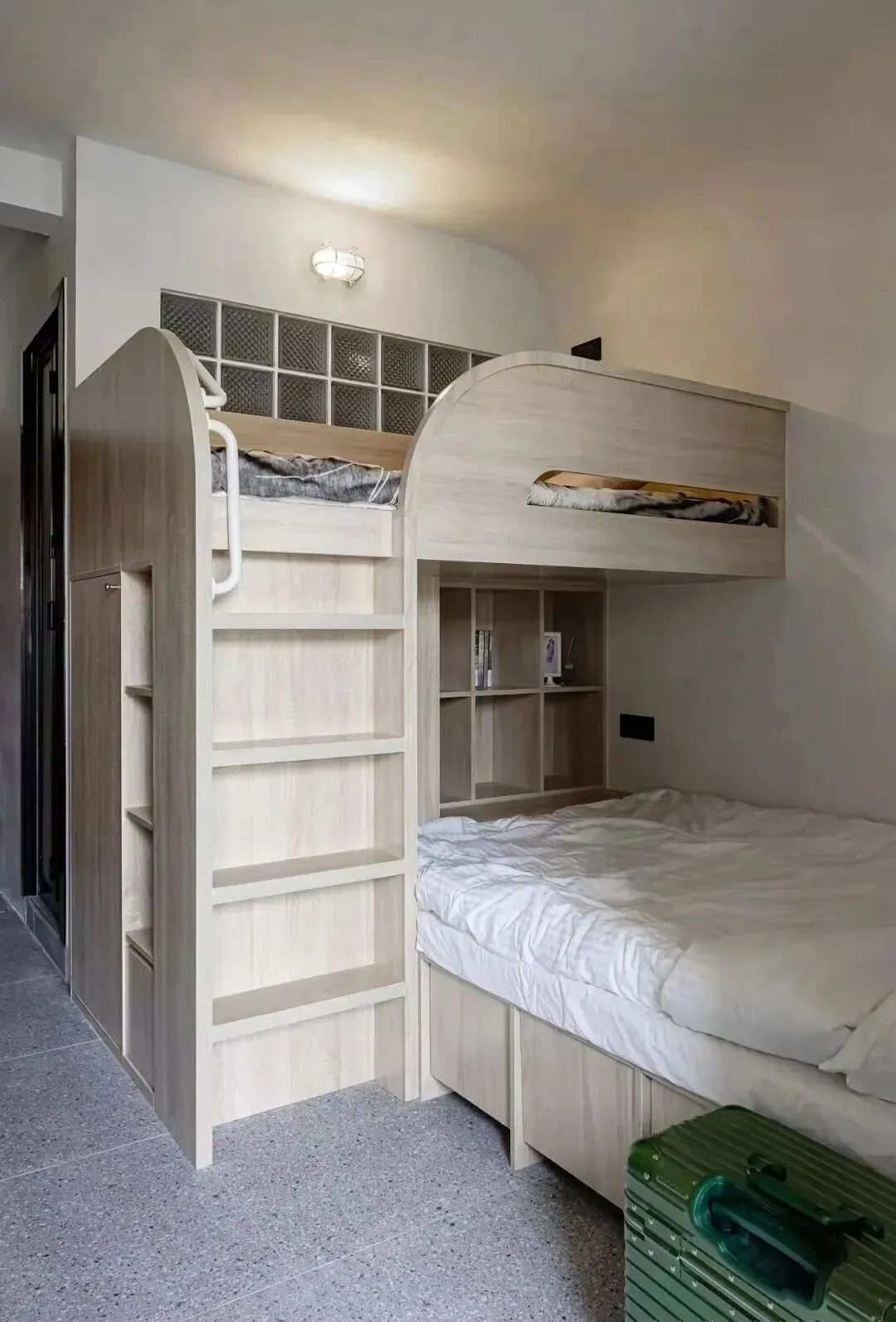 下方定制了1.5米宽的榻榻米作为大人床,上方是1.2米宽的儿童床,虽不宽敞但很实用。