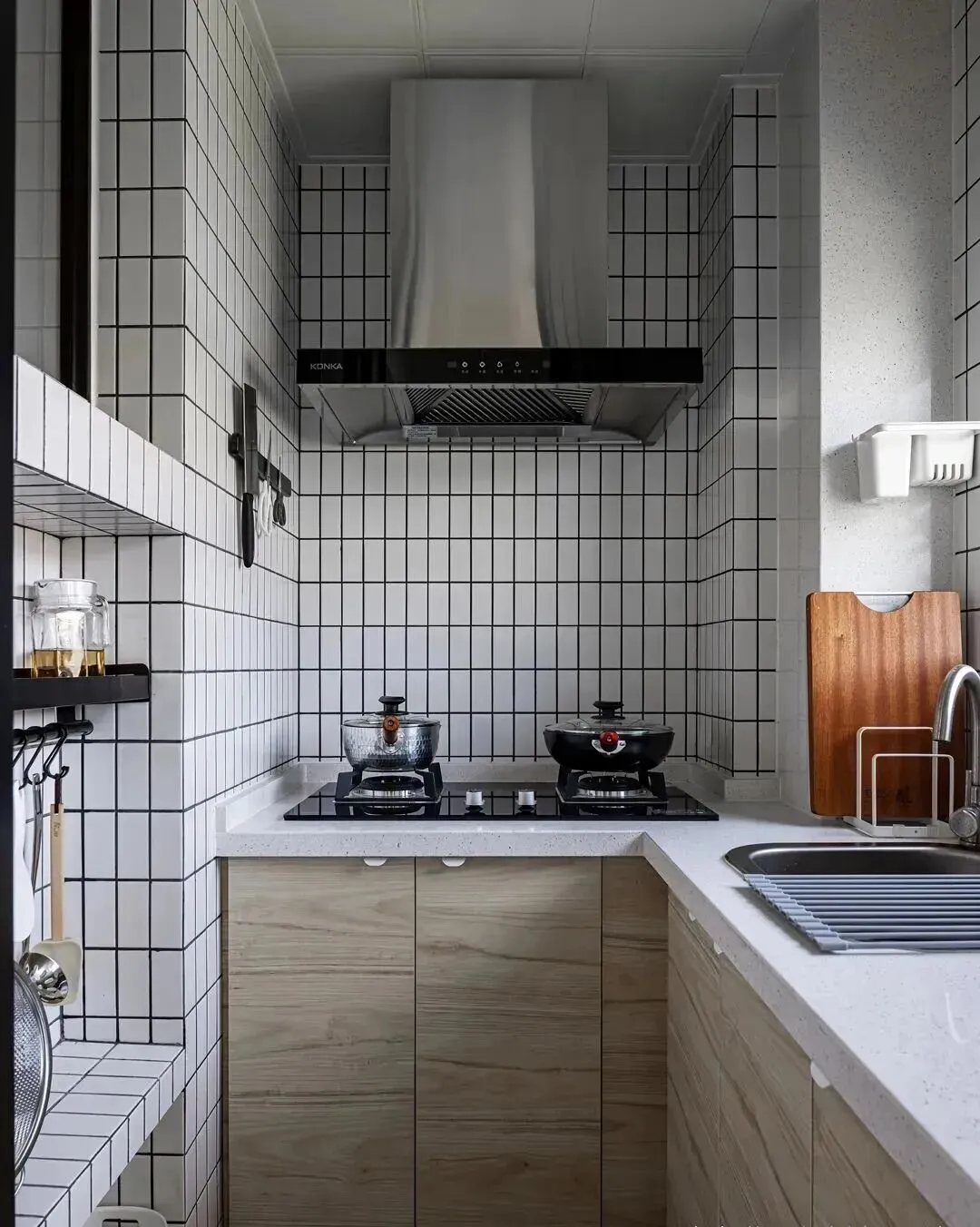 厨房内也刚好利用窗口下的位置设计了壁龛用来放小餐具厨具,非常好用。
