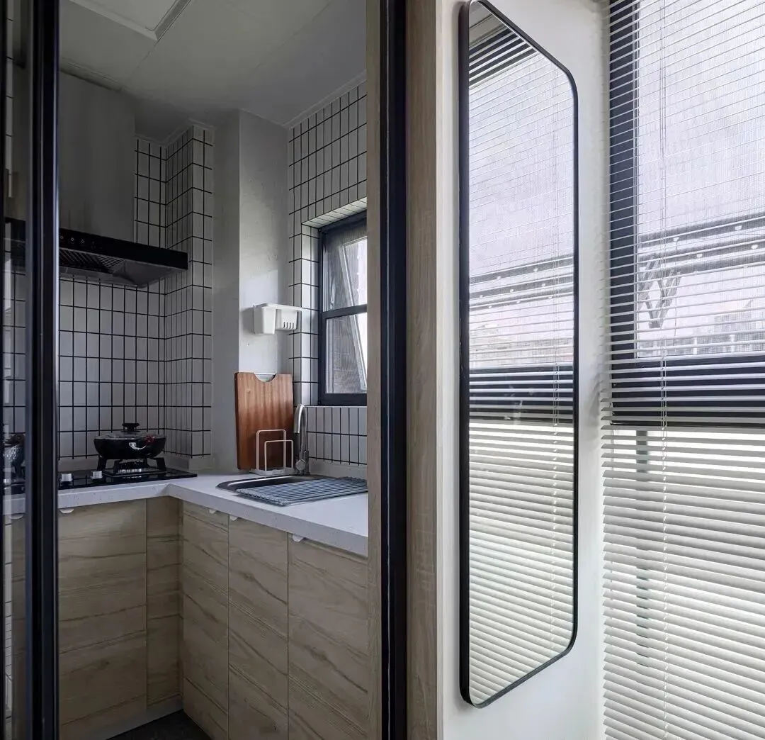 厨房门口的墙上安装了穿衣镜,厨房内是比较北欧风的搭配,白色格子砖搭配原木色橱柜,清爽简约。