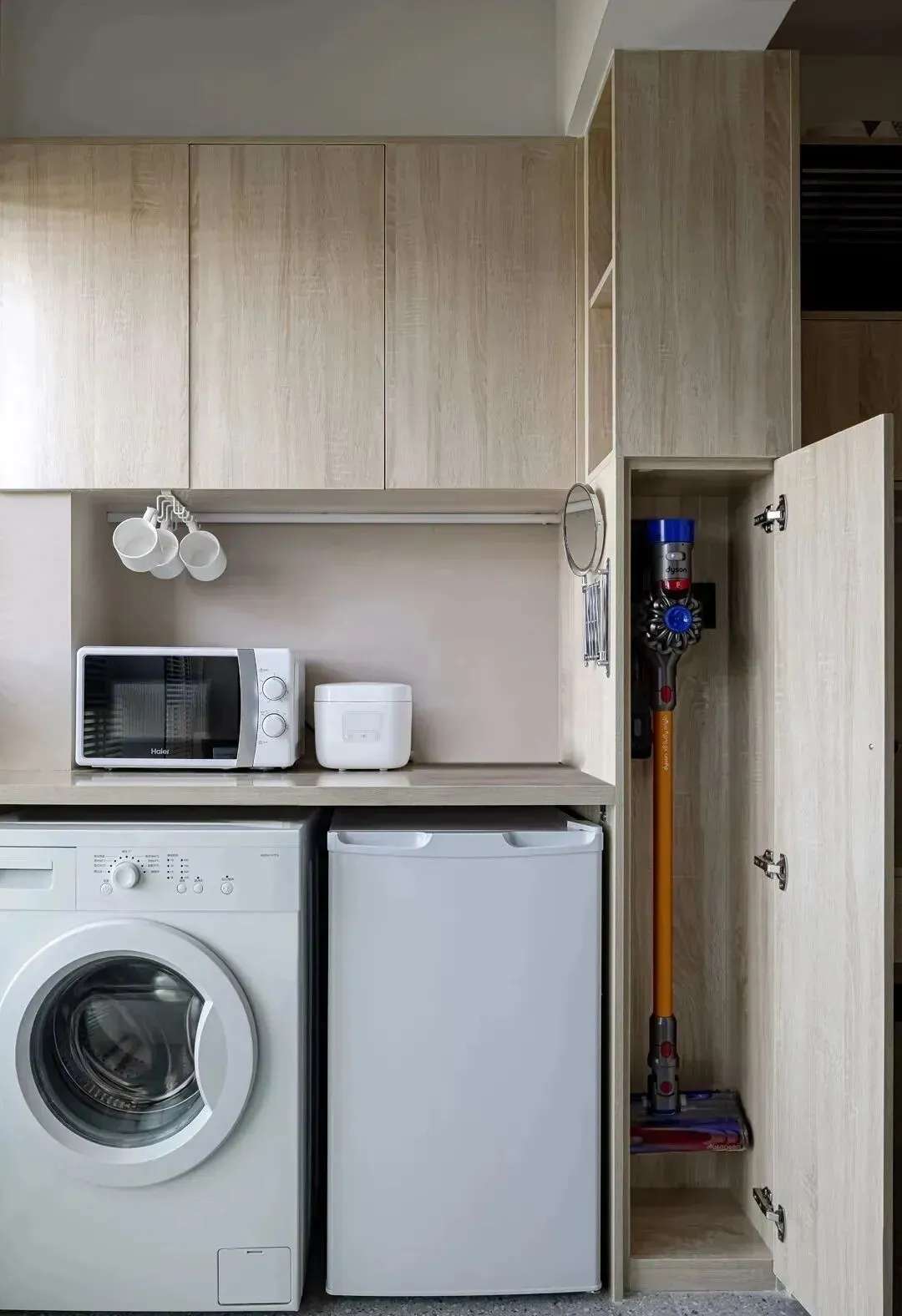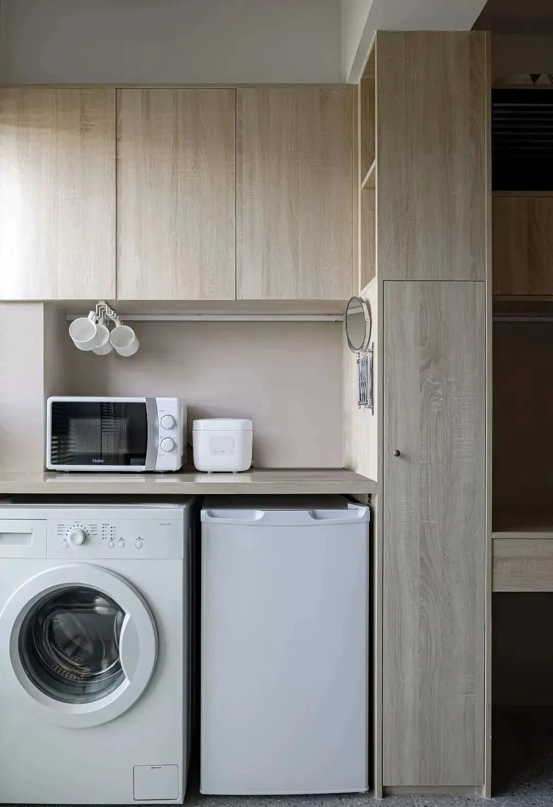 厨房对面是阳台,设计了台面+吊柜的形式,台面下放置了洗衣机和小冰箱,台面上可以作为厨房的补充台面用来放小厨电,用起来也很顺手。