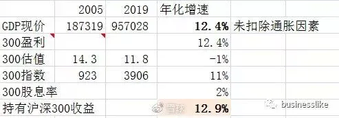 从2005年底至今的十四年中,300成份的利润涨幅年均12.4%,与同期GDP现价涨幅相当,但是,其整体估值则从05年12月31日的14.3倍,降到了到19年11月15日的11.8倍,年缩水1%;在加上期间平均股息2.09%,过去十多年,长期持有沪深300的年化收益是12.9%。居然也跑平了GDP现价的年均涨幅。