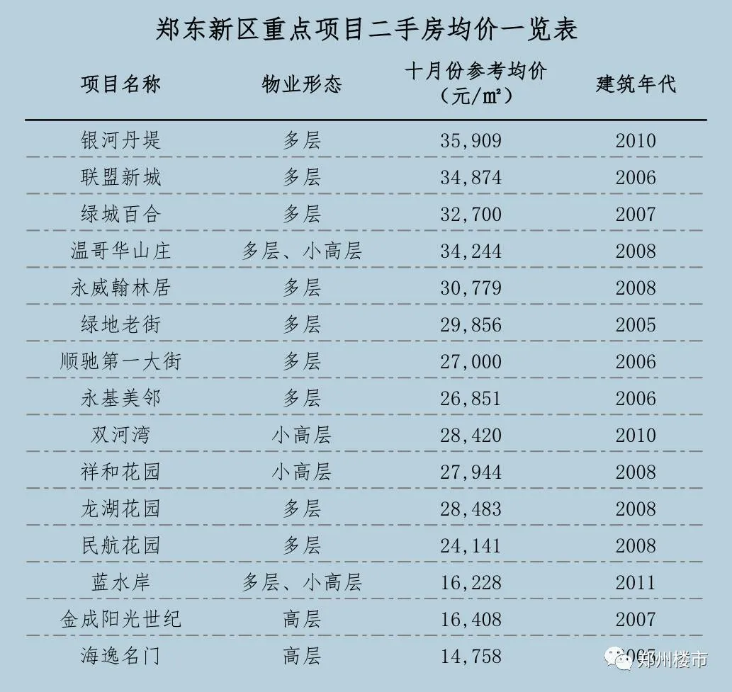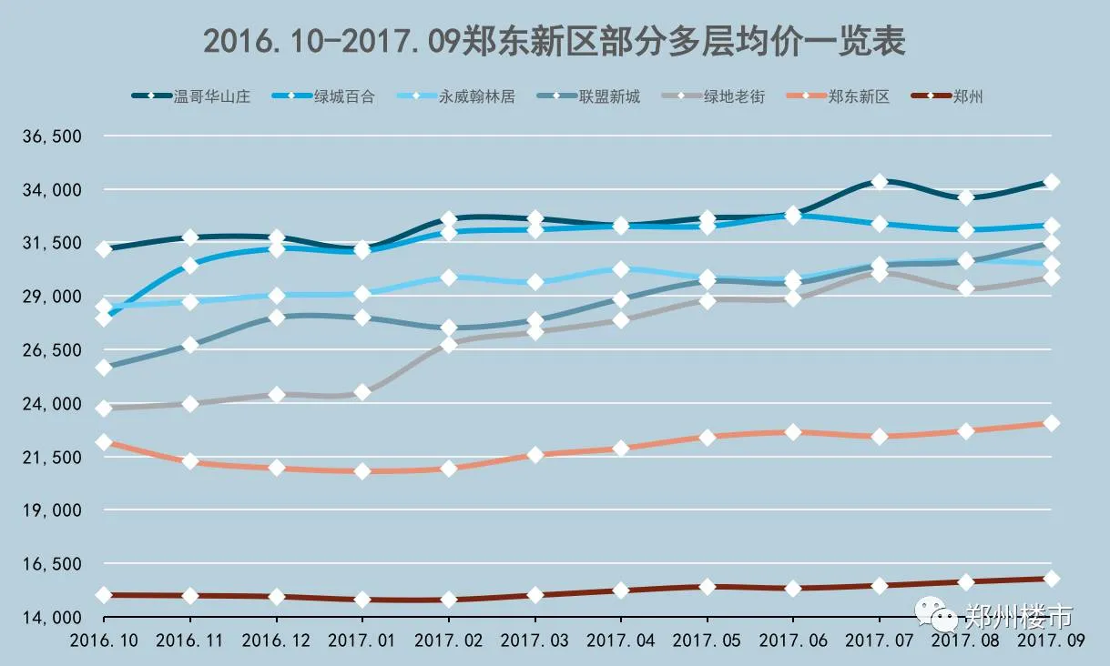 如图所示,笔者整理了郑东新区一部分重点项目,取样标准按照业态分为多层、小高层、高层,取样时间为2016.10-2017.09也就是最近一年的房价变化趋势。