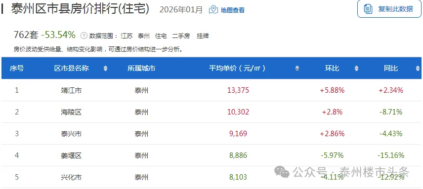 泰州近一月二手房挂牌均价1.01万元/㎡,挂牌均价最高的是靖江市为13375元/㎡。