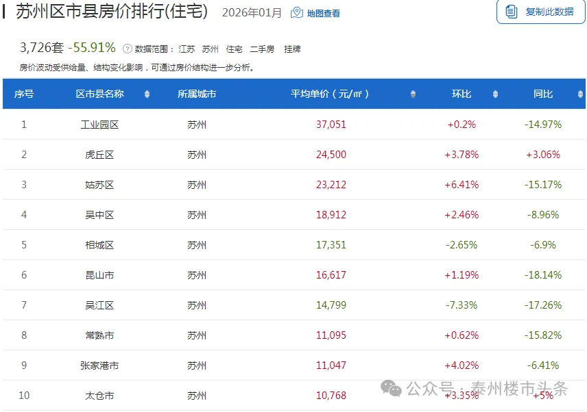 苏州近一月二手房挂牌均价1.77万元/㎡,挂牌均价最高的是工业园区为37051元/㎡。