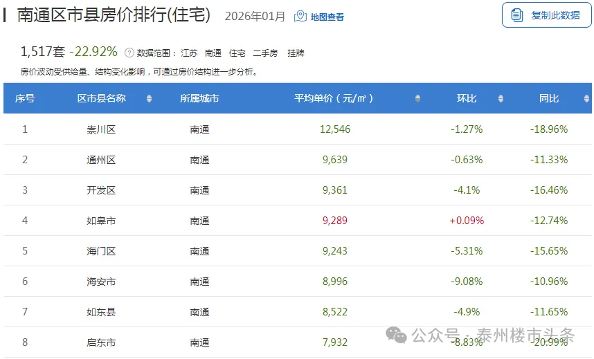 南通近一月二手房挂牌均价1.04万元/㎡,挂牌均价最高的是崇川区为12546元/㎡。
