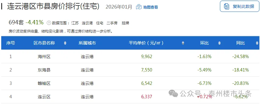 从具体区域来看,1个区域房价环比上月呈现上涨趋势,3个区域房价呈现下跌趋势,赣榆区降幅最高,降幅6.73%。