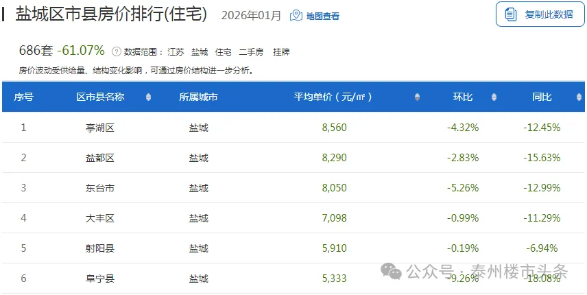 从具体区域来看,6个区域房价全部下跌,阜宁县降幅最高,降幅9.26%。