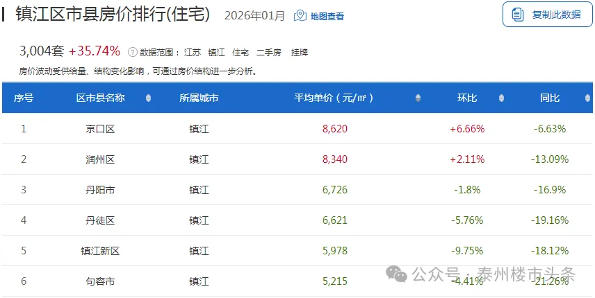 从具体区域来看,2个区域房价环比上月呈现上涨趋势,4个区域房价呈现下跌趋势,镇江新区降幅最高,降幅9.75%。