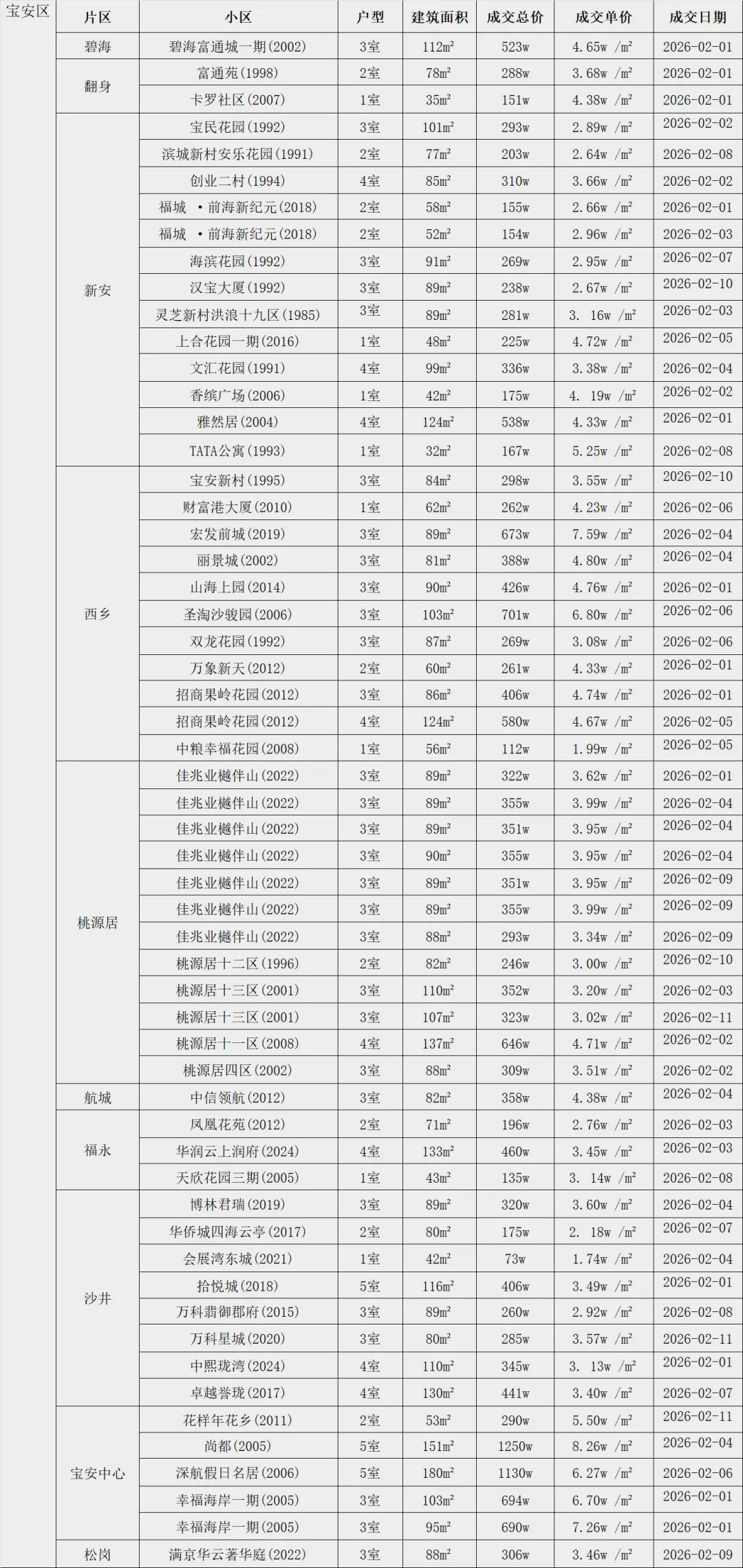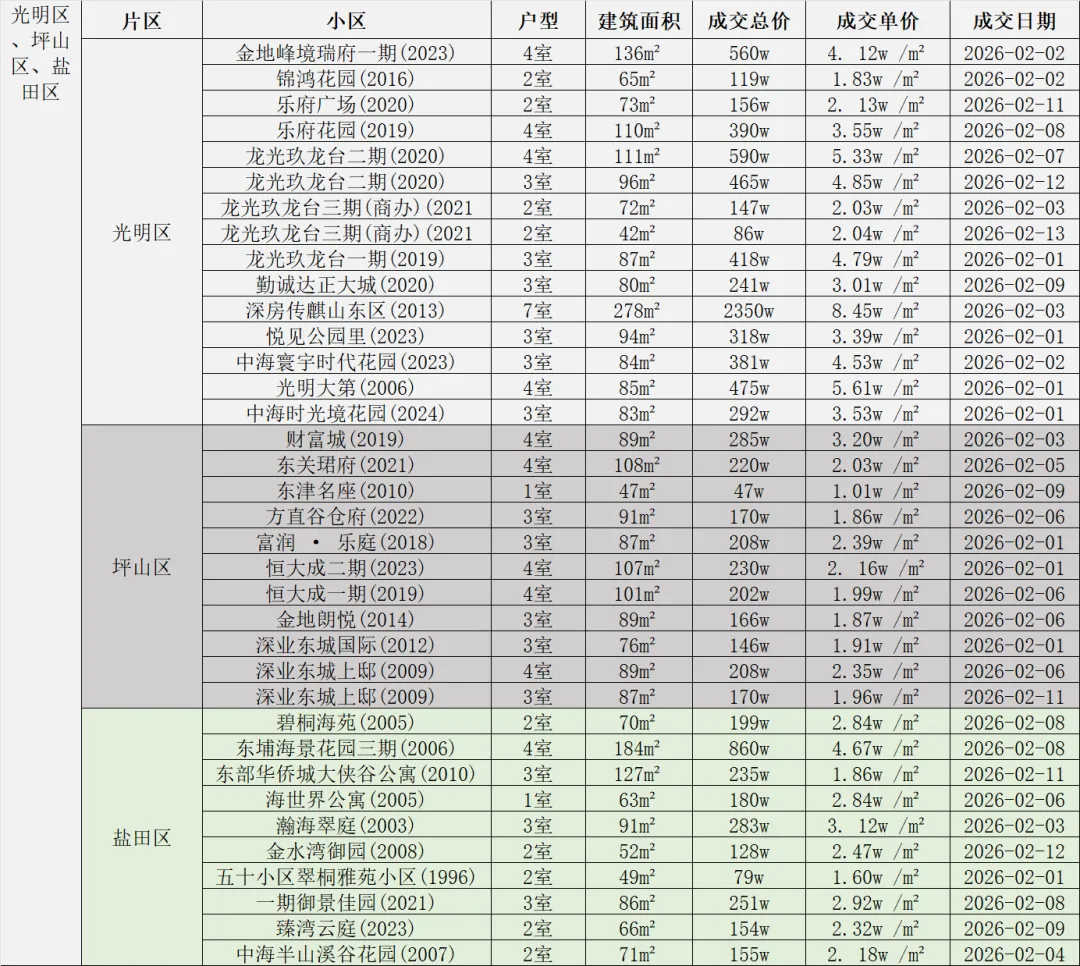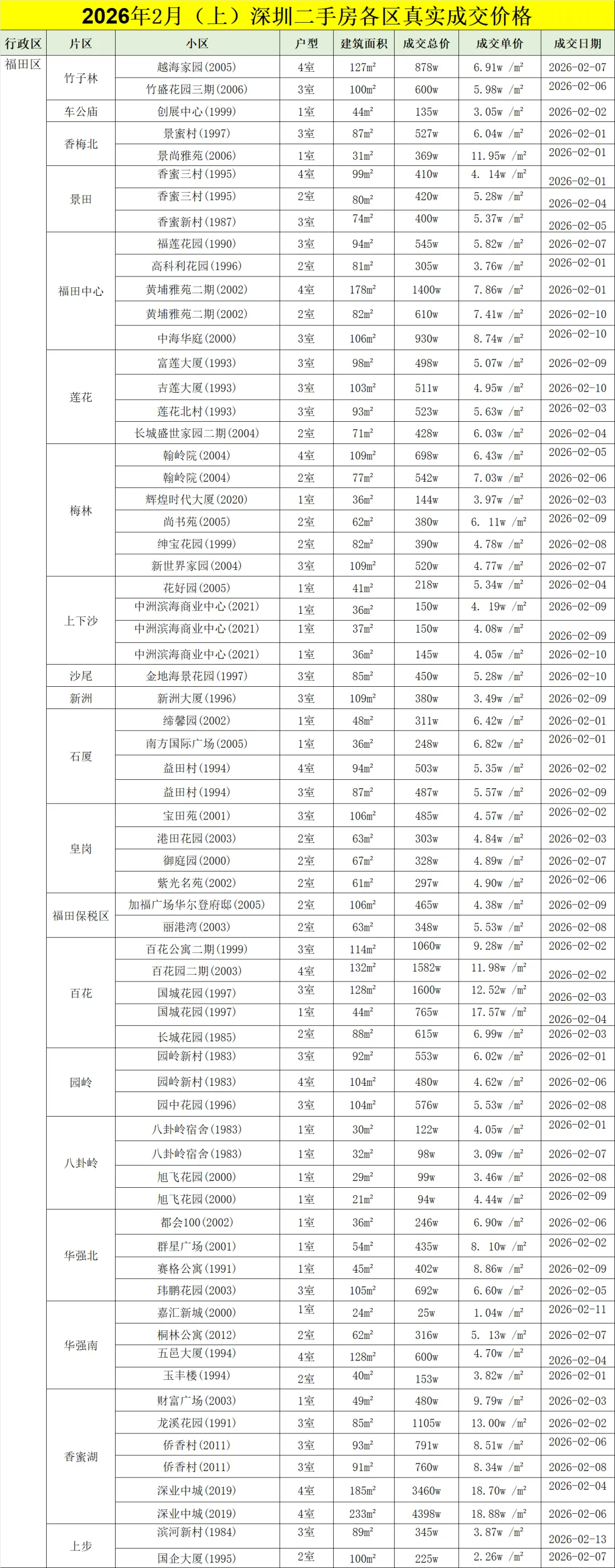 重磅! 深圳2026年1月(上)二手房真实成交价数据表!(含各片区)