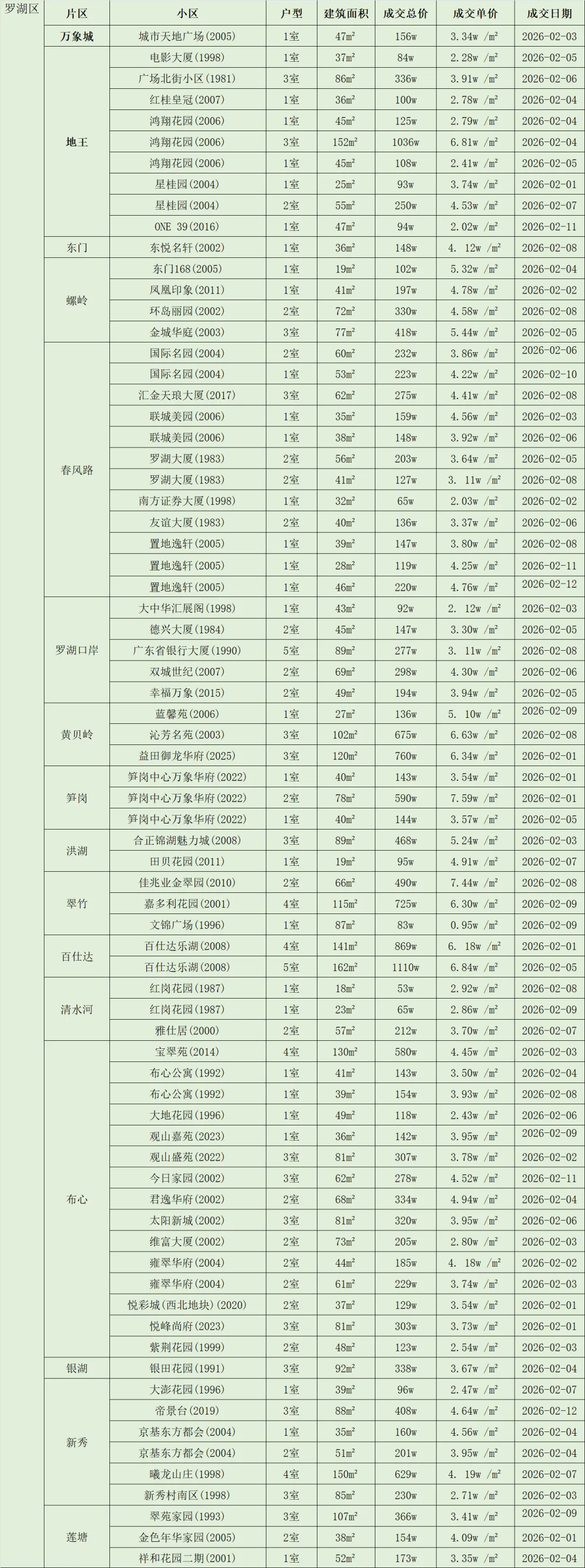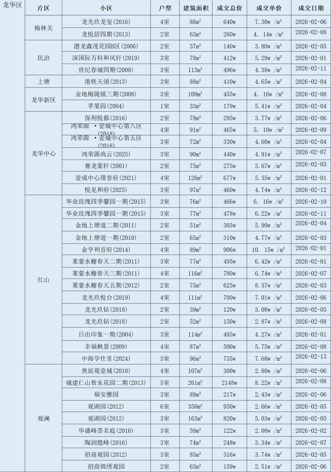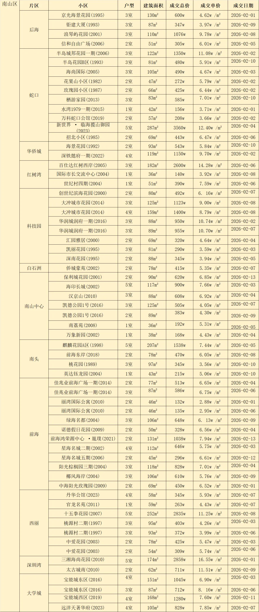 重磅! 深圳2026年1月(上)二手房真实成交价数据表!(含各片区)