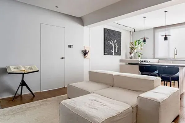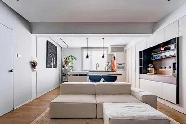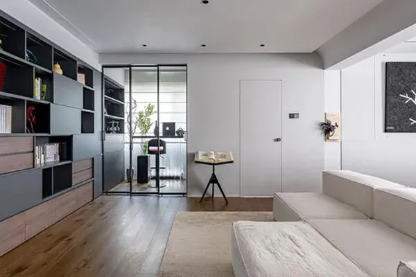 在Alan的引导下,首先踏入了家的心腹区域:客厅了。在落脚的瞬时间,就被它的简约感所征服了。设计师Claire将一张可以随意组合的模块化白色沙发,与温厚的原木地板,与一面简洁的墙面,就此勾勒出了一处利落简洁的休憩空间了。有趣的是,这张白色沙发,它是这几年里一款网红的家具单品,设计出自一位瑞士设计师。这张沙发,以简练的线条,优质的软包,高端的缝合,以及舒适的坐感而著称。同时,可以随意组合,这也让这个客厅里,多了一份灵动感。在这简单的几件家具里,疏密有致,秩序盎然,层次丰富,让人徜徉在现代简约的氛围之中。这间客厅,它美得如此简约,美得如此撩人,它也让人眼前一亮,耳目一新了。在这有限的客厅里,徜徉在舒适之中,抒写了家的澹雅情韵,也标记了家的舒展韵味了。