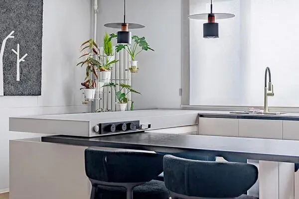 稍稍走了几步,来到了餐厨空间。设计师Claire在这个方寸之地里,将厨房与餐厅一体化设计。承袭了白色的调性,一张简约淡雅的木质餐桌,两张蓝丝绒的餐椅,在色彩上打破了空间的静谧与沉寂感,而在厨房空间里,白色的精致橱柜,与尔雅的灶具,和高端的五金,组合出一隅大方硬朗的空间来。值得一提的是,在厨房与餐厅的一角里,设计师Claire精巧设计了一组绿植,似乎莞尔间让这个餐厨空间返璞归真,回归自然,让享用美食的时刻,也体验着清新瑞丽的大自然风景了。人们常说:“生活无非一日三餐。”在这个有序的餐厨空间里,一半诗意烂漫,一半烟火缭绕,一半生活家,一半桃花源了。不论你来自何处,这世间也不能辜负了美食与爱了。餐厨空间里,浓缩了家的舒适感,也构成了家中点睛一笔,悄然构筑了家的烟火聚集地了。