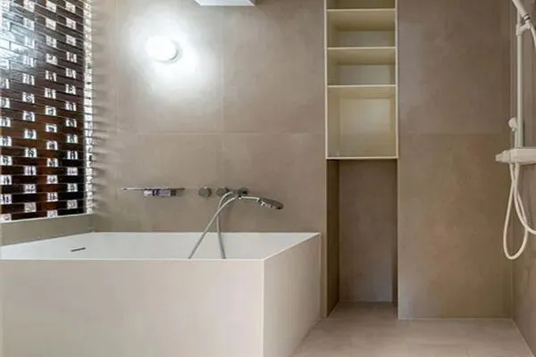 移步到了卫浴间。在这间面积不小的卫浴间里,看到了设计师Claire的匠心与匠艺了。在将干湿分离之后,设计师Claire采用了纹理细致的米色大理石作为墙面,地板以防滑地砖为主,特别值得留意的是,一个方形的百年法国卫浴品牌大浴缸,是空间的焦点了。当轻柔的水珠,轻巧地流出,在一刹那间,水珠流过了皮肤,彷如洗去了身上的负能量,在曼妙的精油的舒展中,沐浴也成了馥郁芬芳的体验之旅了。在这里,Alan总能将身心压力释放,从这里走出,他也好似获得了新生,一切的烦恼都抛之脑后了。