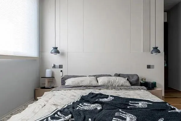 来到了卧室空间。这间卧室的面积不大,而设计师Claire说:“卧室的面积无需过大,它如同是母亲的子宫,让孩子重回安宁之中。”在一张简致的床,与澹雅的床头墙,两盏对称的灰色吊灯下,令人静心休憩,循环纳新,也尽享和谐之感了。这间温情的卧室里,让每一夜都变得安静安全。它拒绝了卧室的刻板印象,不落窠臼,也具备了畅快的呼吸质感。Alan说:“在这间卧室里,我感到久处不厌,让睡眠也变得至臻有趣了。”