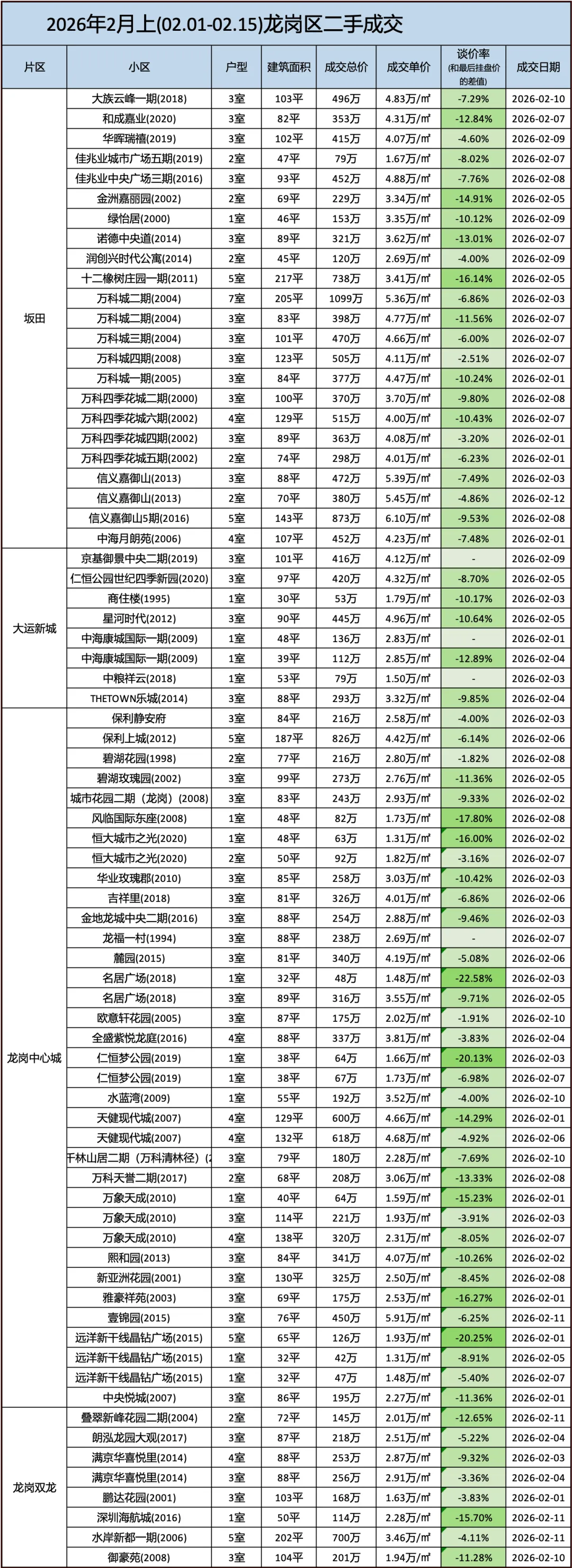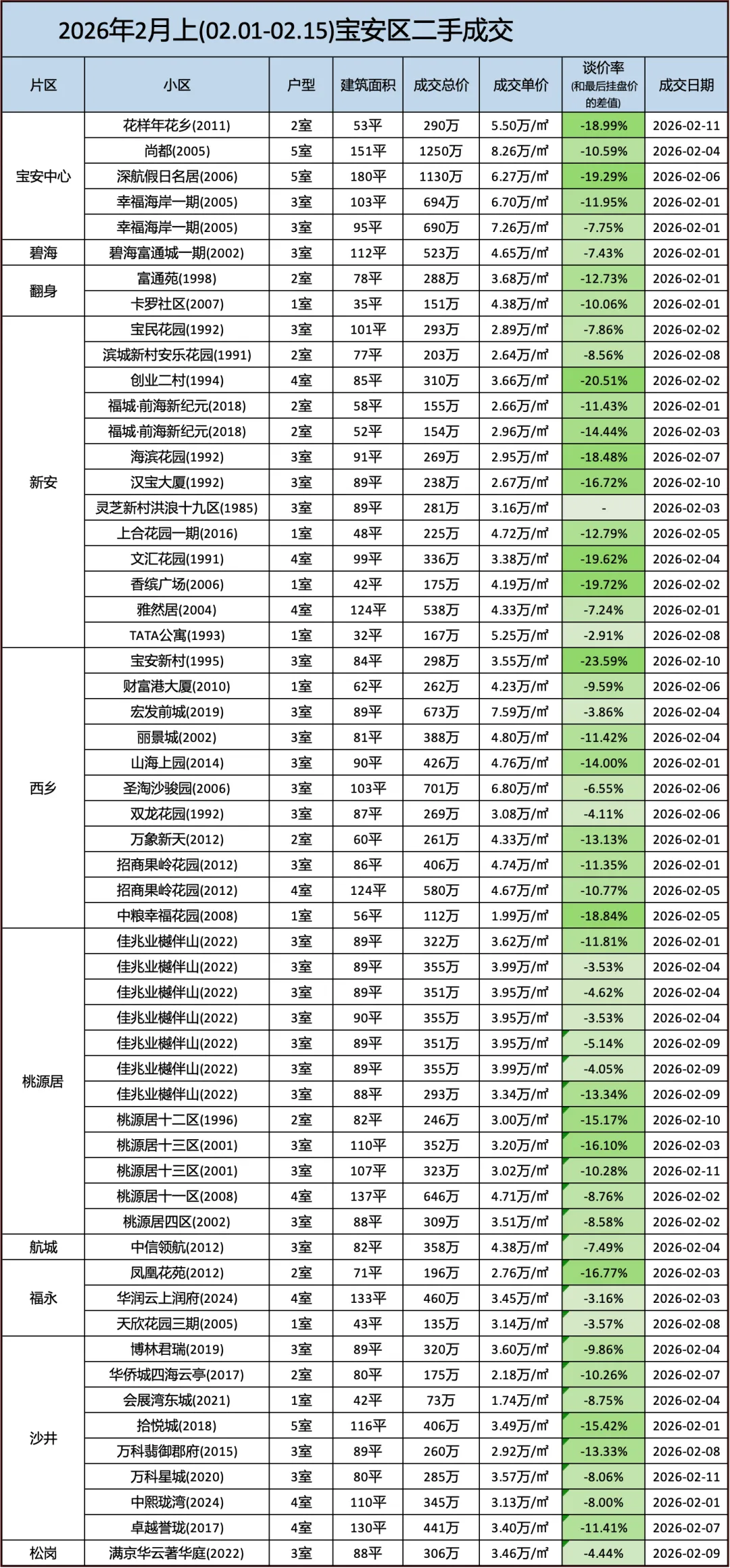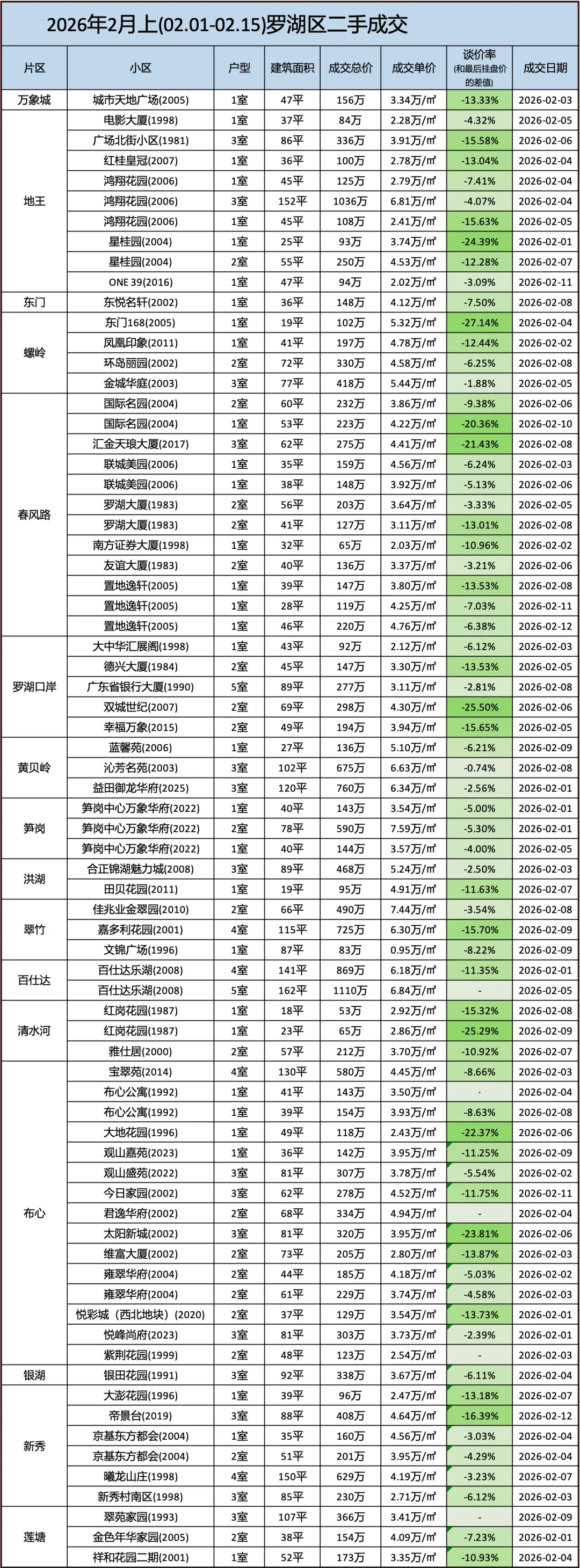 定期整理深圳二手房的成交数据,本次统计时间为:(2026.2.1-2.15)以下为深圳其中几家大机构的总和数据,从挂盘价到实际成交价的浮动率,应该也相当有参考价值了。