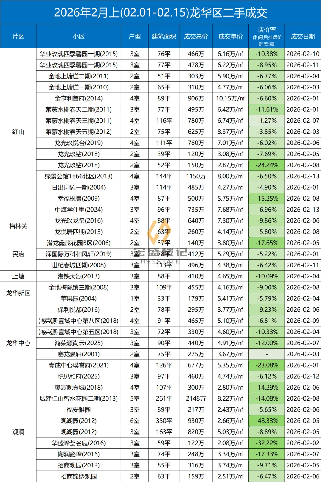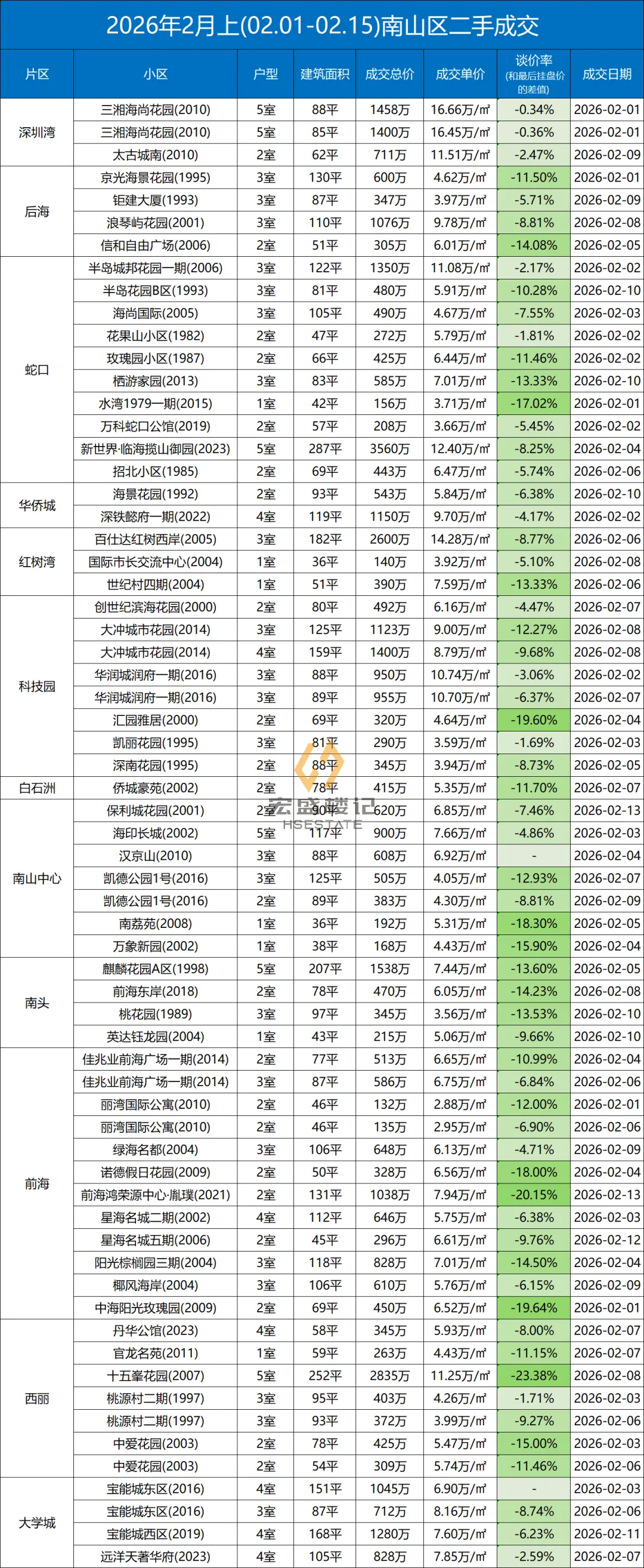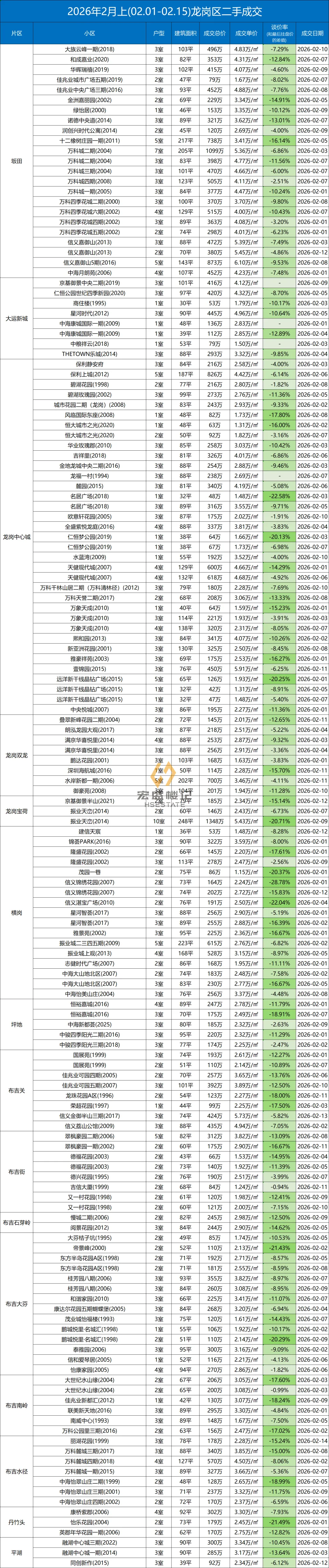 定期整理深圳二手房的成交数据,本次统计时间为:(2026.2.1-2.15)以下为深圳其中几家大机构的总和数据,从挂盘价到实际成交价的浮动率,应该也相当有参考价值了。