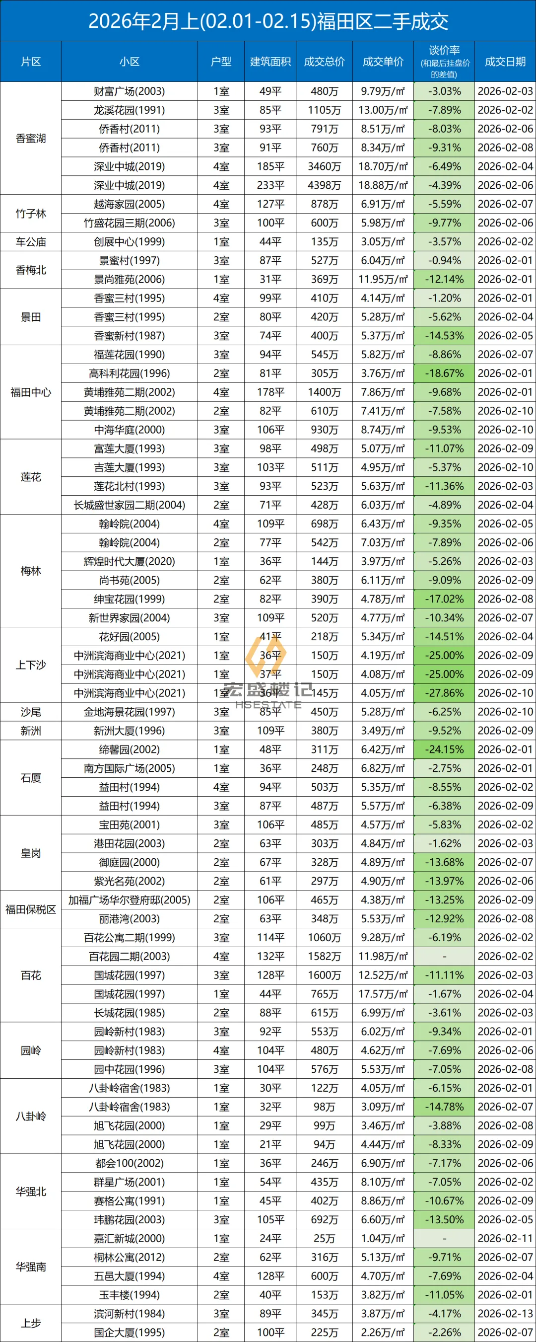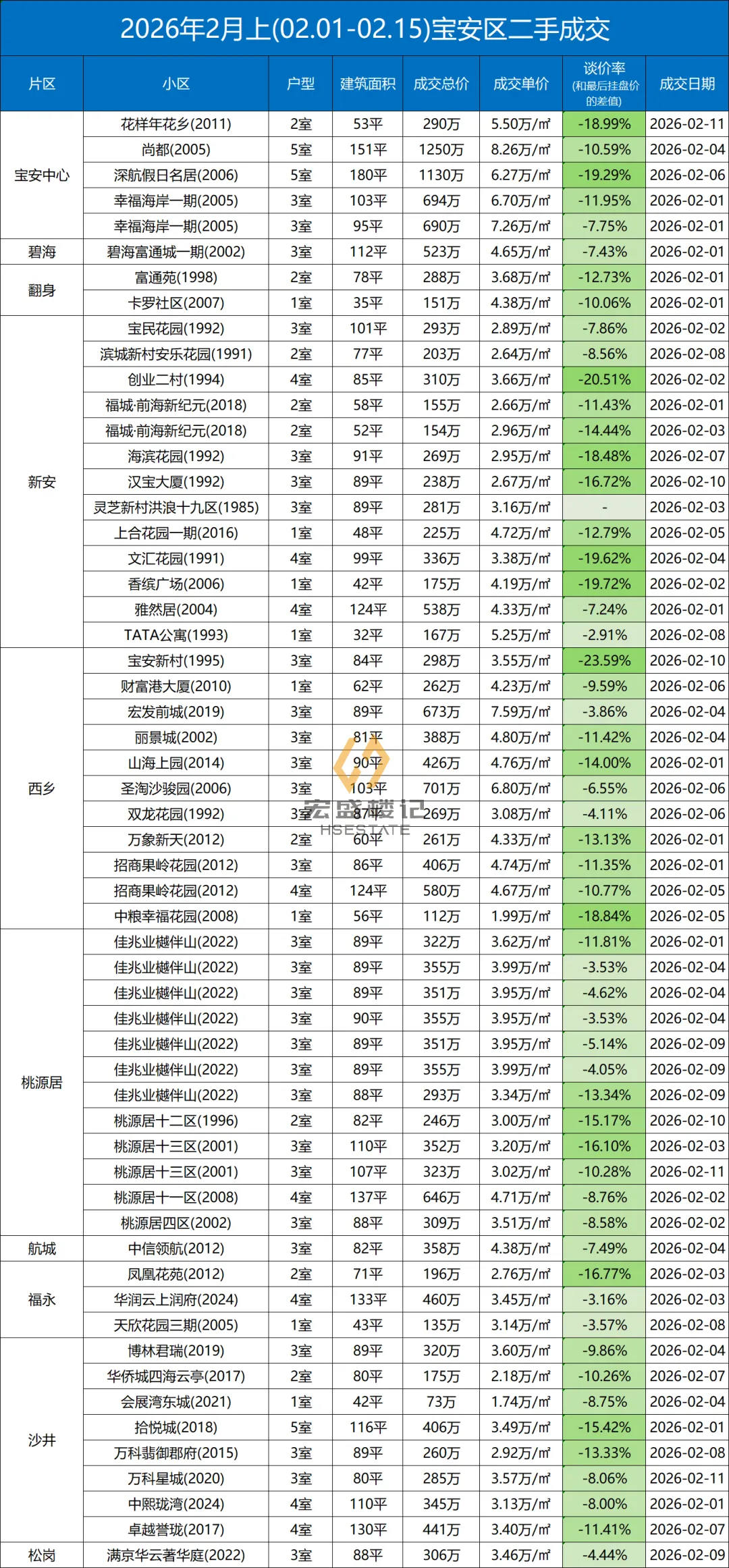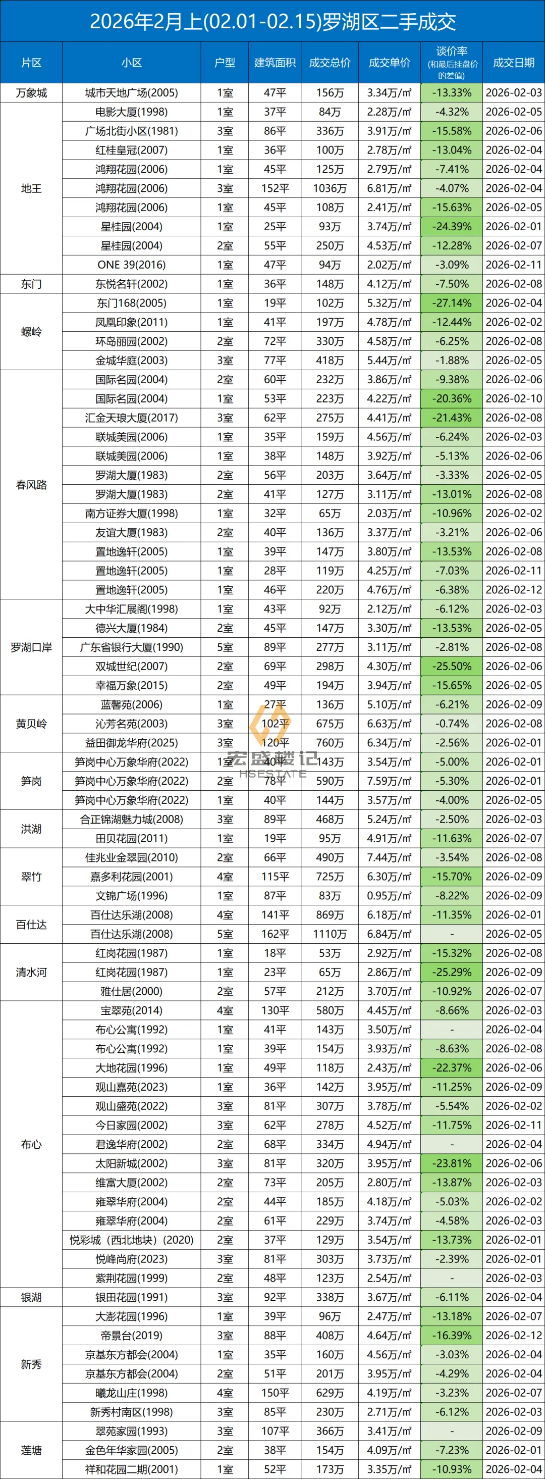 定期整理深圳二手房的成交数据,本次统计时间为:(2026.2.1-2.15)以下为深圳其中几家大机构的总和数据,从挂盘价到实际成交价的浮动率,应该也相当有参考价值了。