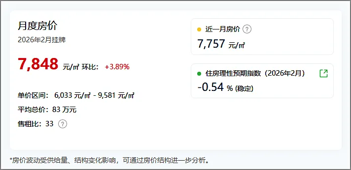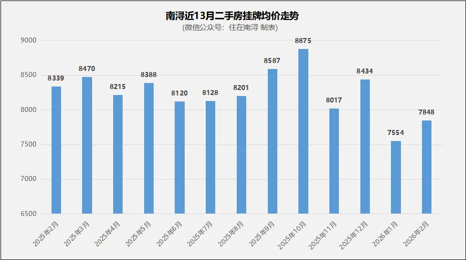 据全国房价行情网数据统计,刚刚过去的2026年2月,南浔二手房住宅挂牌均价约7848元/m²,较上月环比上涨3.89%。与去年同期(2025年2月)相比,同比下跌约6%。