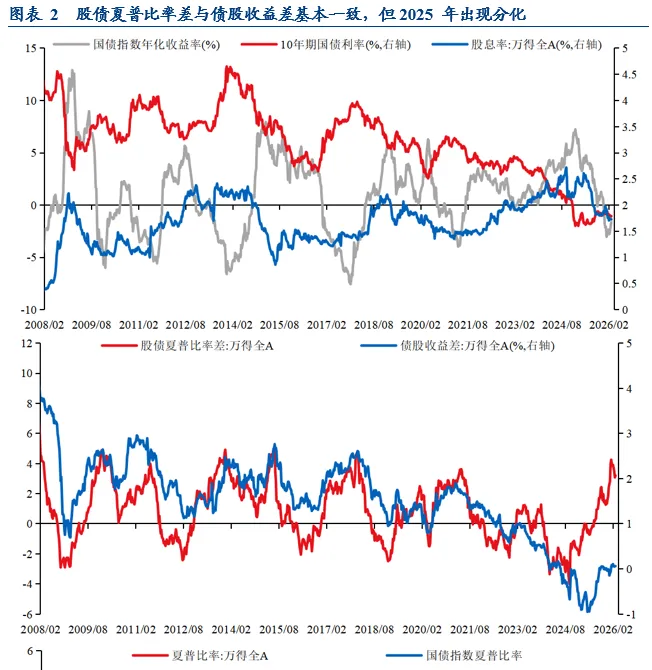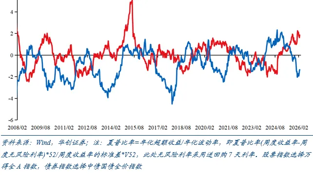 我们发现,历史经验来看,股债夏普比率差与债股收益差走势趋同。截至2026年2月27日,股债夏普比率差为3.21,超过9月中旬2.43的高点,处于历史相对高位(十年94.2%分位数),凸显出股票相对于债券的配置性价比。但债股收益差为0.06%,处于历史低位(十年17.6%分位数),表明债相对于股依然偏贵。因而,我们认为,当前股相对于债依然有更高的配置价值。
