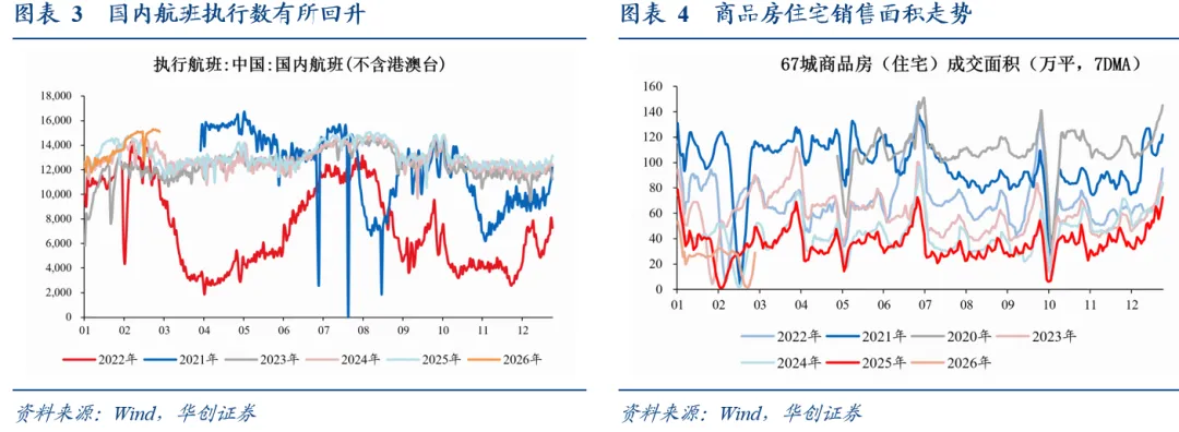 工业生产:1)行业开工率:环比来看,节后螺纹、江浙织机、半钢胎、全钢胎等开工率回升,唐山高炉、PVC、焦化等上游开工率有所回落。同比来看,PTA开工率弱于去年农历同期,其余行业好于去年农历同期。2)节后开复工数据:据百年建筑调研,截至2月25日(农历正月初九),全国201家建筑施工头部企业(24年187家,25年222家)共10692个工地(24年10094家,25年13532家)开复工率为8.9%,农历同比增加1.5个百分点;劳务上工率15.5%,农历同比增加3.7个百分点;资金到位率29%,农历同比增加9.4个百分点。