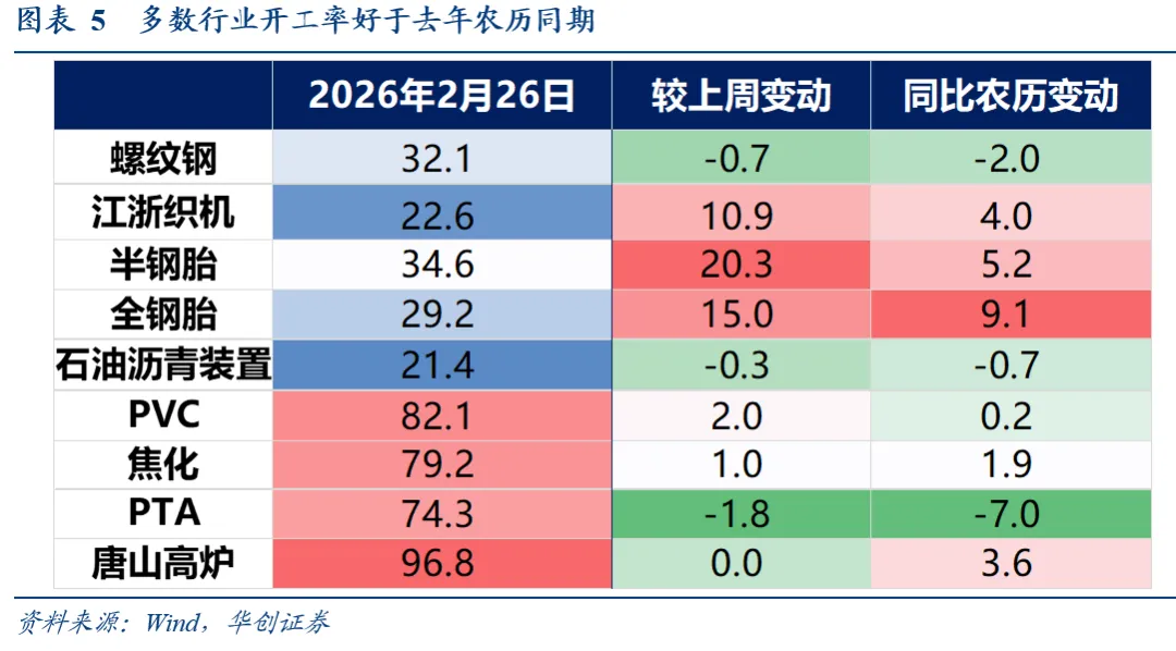 2、节后复工开工率好于去年。据百年建筑调研,截至2月25日(农历正月初九),全国201家建筑施工头部企业(24年187家,25年222家)共10692个工地(24年10094家,25年13532家)开复工率为8.9%,农历同比增加1.5个百分点;行业开工率方面,除PTA等少数行业外,其余多数行业开工率好于去年农历同期。