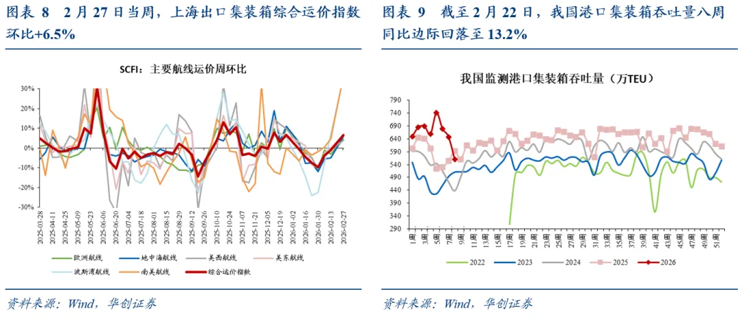 中国出口运价:节后市场恢复良好,远洋航线运价上涨。2月27日当周,上海出口集装箱综合运价指数环比+6.5%,2月13日当周为-1.2%。分航线来看,欧洲航线方面,本周运价环比+4.3%,前值为-3%。北美航线方面,本周美西、美东航线运价环比分别为3.9%、6.6%,前值分别为-0.8%、-0.2%。