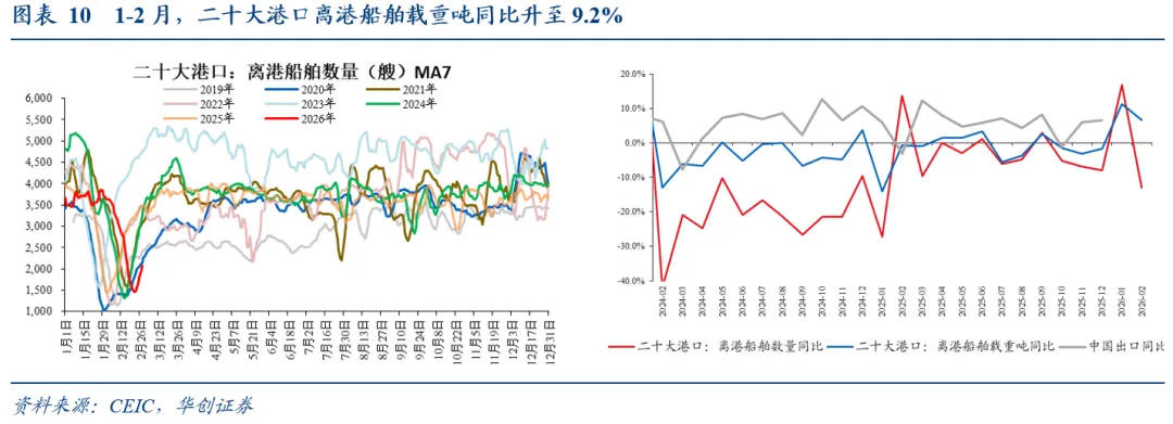 中国出口量:①港口集装箱吞吐量同比居于高位。截至2月22日当周,我国港口集装箱吞吐量环比-13.6%,上周为-4.7%,八周累计同比边际回落至13.2%,上周为15.9%,去年12月底四周同比为7.2%。②二十大港口离港船舶载重吨同比大幅回升。1-2月,二十大港口离港船舶载重吨同比9.2%(1月同比为11.2%),去年12月为-1.6%,去年1-2月为-8.5%