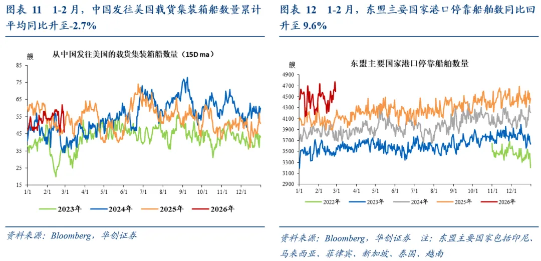 潜在转口:景气或回升。1-2月,东盟主要国家港口停靠船舶数同比回升至9.6%,1月单月同比为7.9%,去年12月为8.7%。
