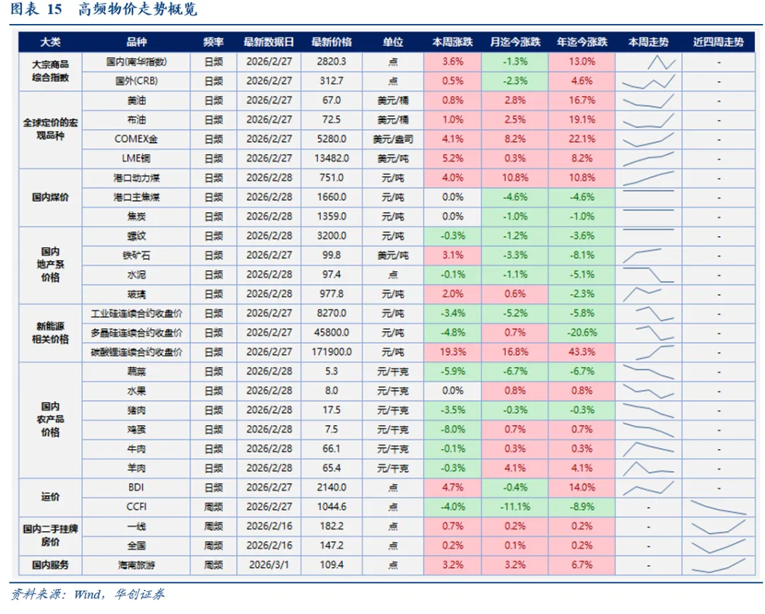 本周,国内大宗商品价格明显上涨,南华综合指数上涨3.6%。海外大宗商品价格小幅上涨,RJ/CRB商品价格指数上涨0.5%。