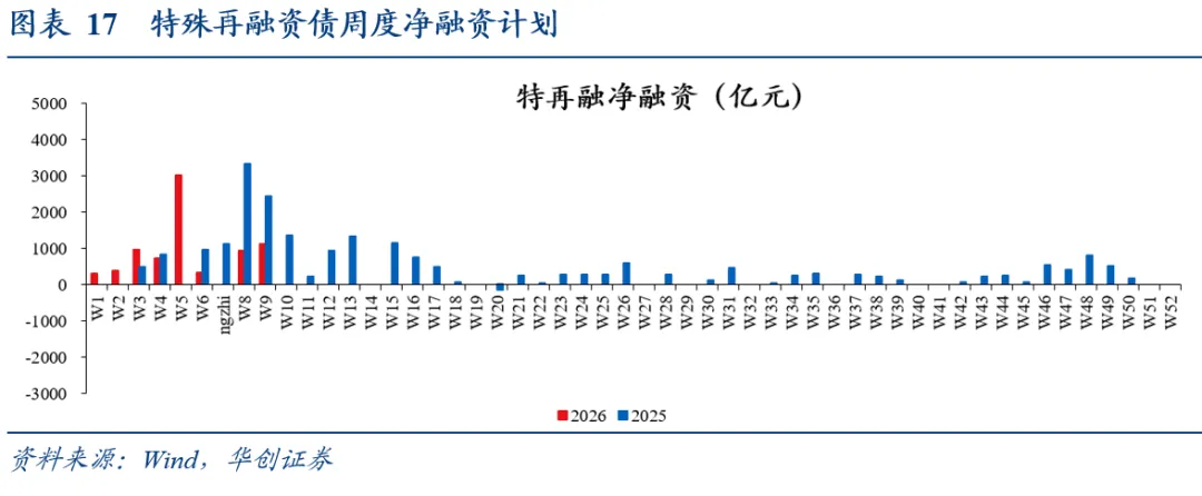 特殊地方债(用于化债、清欠等非项目用途)发行计划更新:已公布3月2日当周特殊地方债计划1125亿,其中特殊再融资债净融资(用于化债)1125亿,特殊新增专项债发行(用于化债、清欠)0亿;1-2月特殊再融资债累计净融资6645亿,去年同期为6713亿;1-2月特殊新增专项债累计发行946亿,去年同期为805亿。