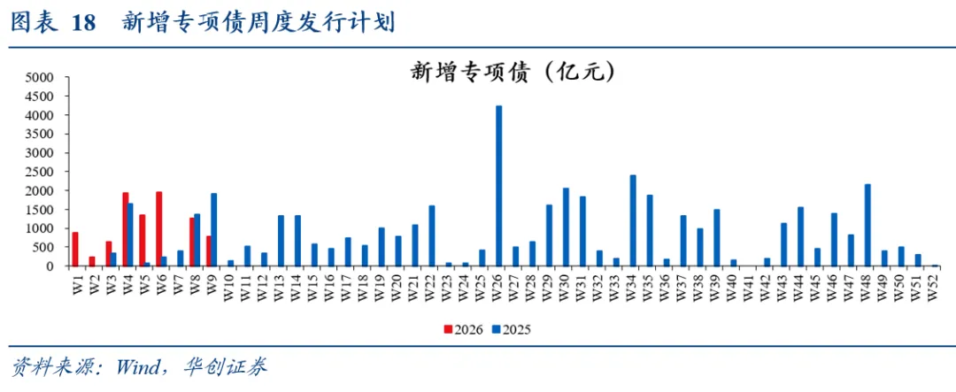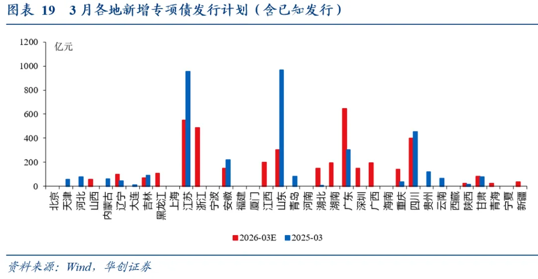 新增地方债发行计划更新:3月2日当周计划新增发行地方债830亿,其中一般债48亿,专项债782亿;截至3月1日,吉林、上海等30省市披露了2026年3月新增专项债发行计划(含已知发行)4054亿(2025年同期,已披露地区实际发行3575亿),披露了26Q1新增专项债发行计划共12279亿(2025年同期,已披露地区实际发行9316亿);1-2月新增专项债累计发行8242亿,去年同期为5968亿。