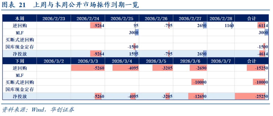 截至2月28日,DR001收于1.3189%,DR007收于1.5034%,R007收于1.5074%,较2月14日环比分别变化+0.68bps、+18.23bps、+16.27bps。本周净回笼资金4614亿,下周到期资金25250亿。