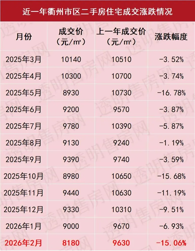 从成交价格来看,2026年1-2月衢州市区二手房住宅成交均价为8660元/㎡,同比去年下跌10.26%。