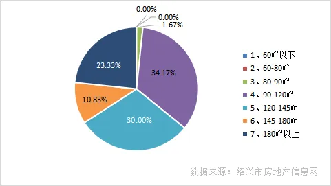 从成交面积上来看,90平米以下的房源成交量占商品住宅总成交的0.99%;90平米-145平米的房源成交量占67.98%;145平米-180平米的房源成交量占11.82%;180平米以上房源占19.21%,本月,90平方米-145平方米房源为本月成交主力,与上月相比成交比有所上升,位于城南区域的春映堂前园、位于镜湖区域的华发金融活力城、位于袍江区域的禧樾府等项目均是该类房源成交主力。另,180平米以上房源成交比例有所下降,位于城南区域的春映堂前园、位于城东区域的玖璋云序府、位于城西区域的金江府等项目均是该类房源成交主力。