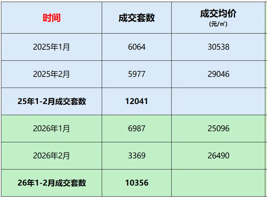 26年1-2月成交10356套,同比25年1-2月的12041套,减少1685套,下降约14%。26年2月成交均价26490元/㎡,同比25年2月29046元/㎡,降幅约8.8%。但环比26年1月25096元/㎡,增长5.6%。